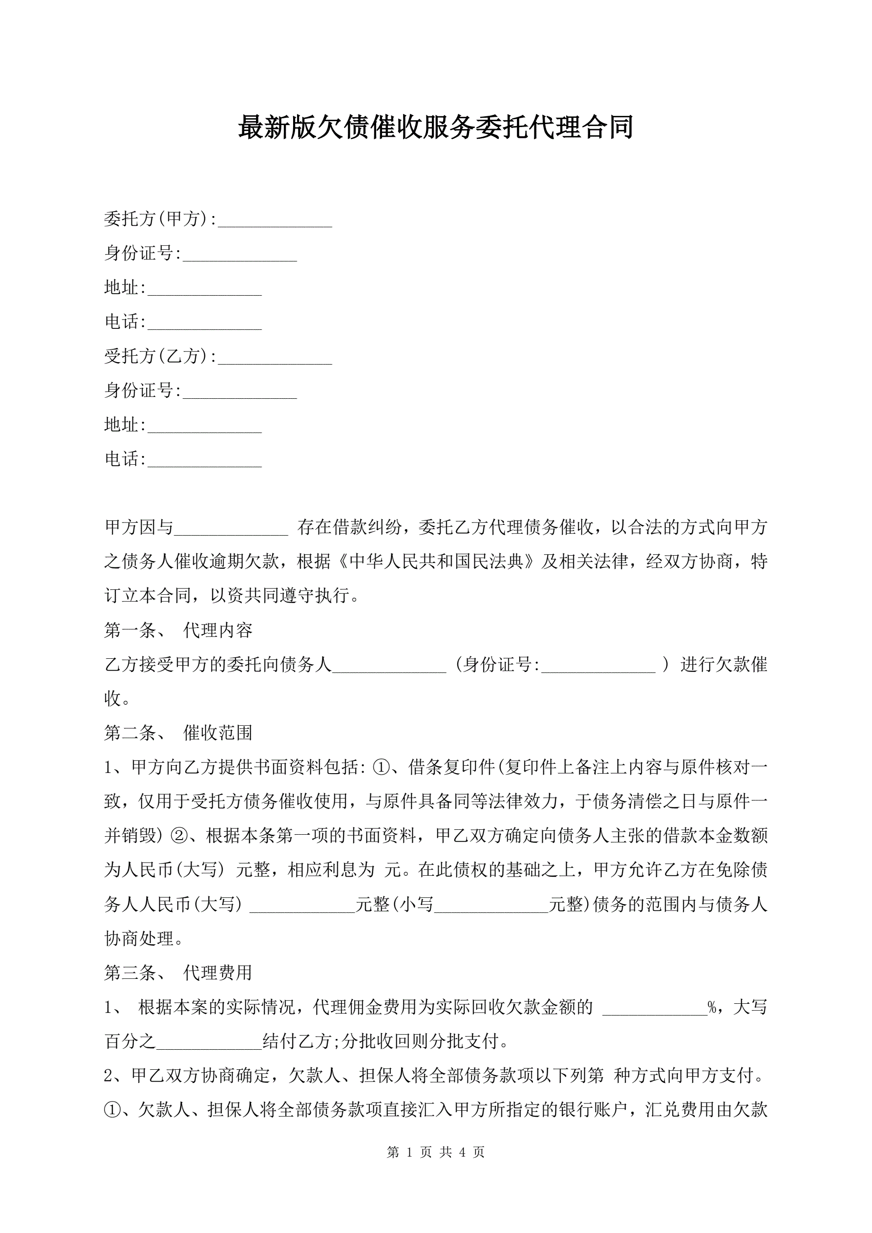 最新版欠债催收服务委托代理合同