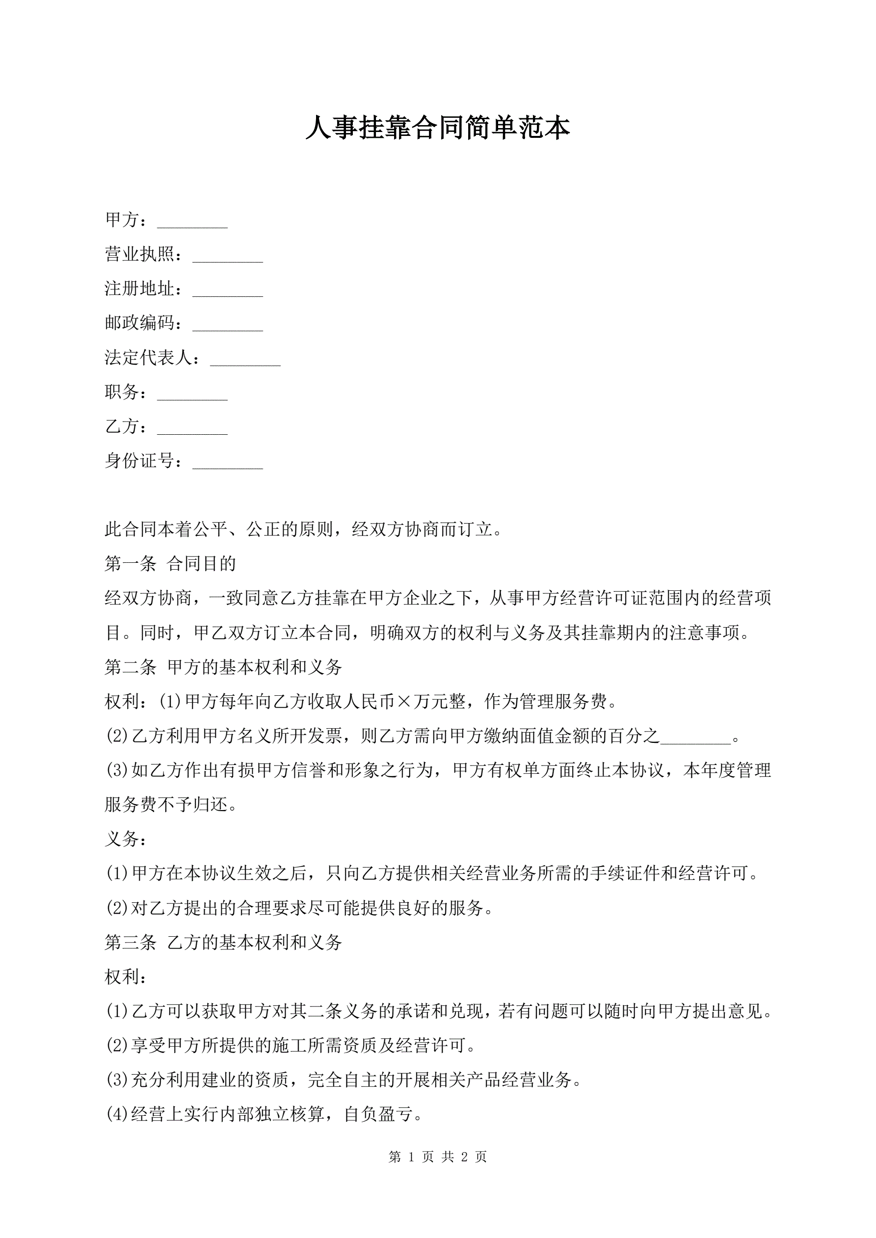 人事挂靠合同简单范本