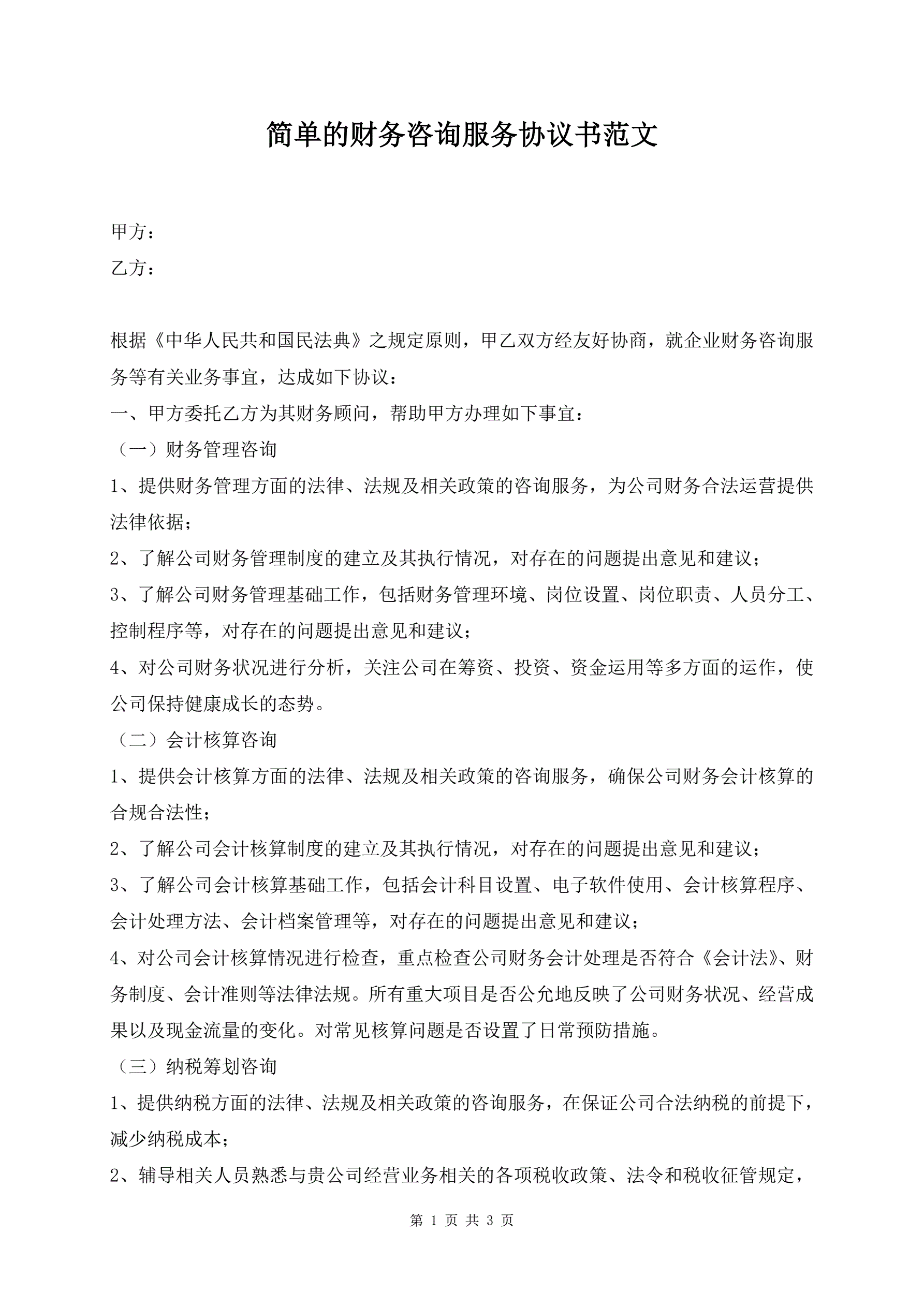 简单的财务咨询服务协议书范文