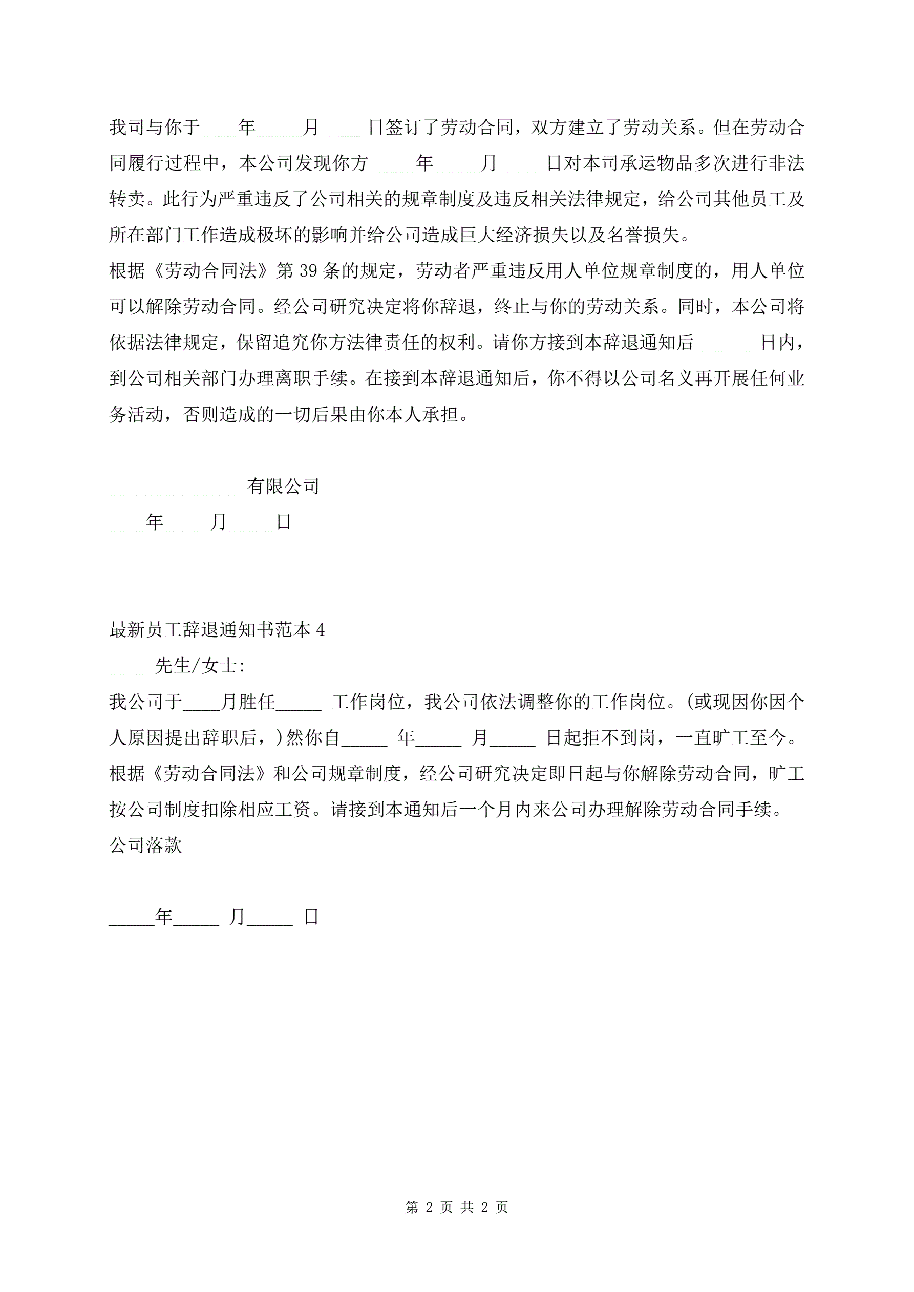 最新员工辞退通知书范本