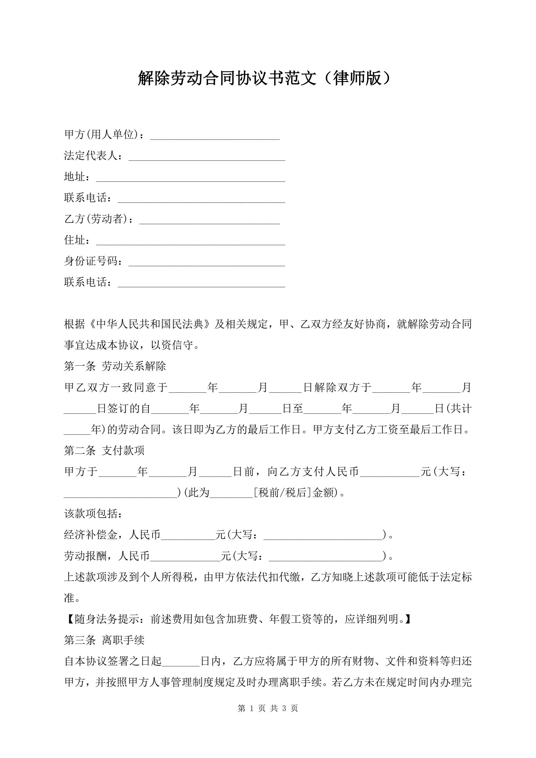 解除劳动合同协议书范文(律师版)