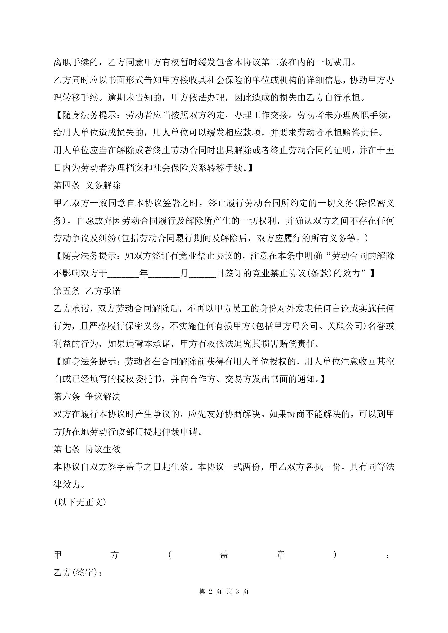 >解除劳动合同协议书范文(律师版)