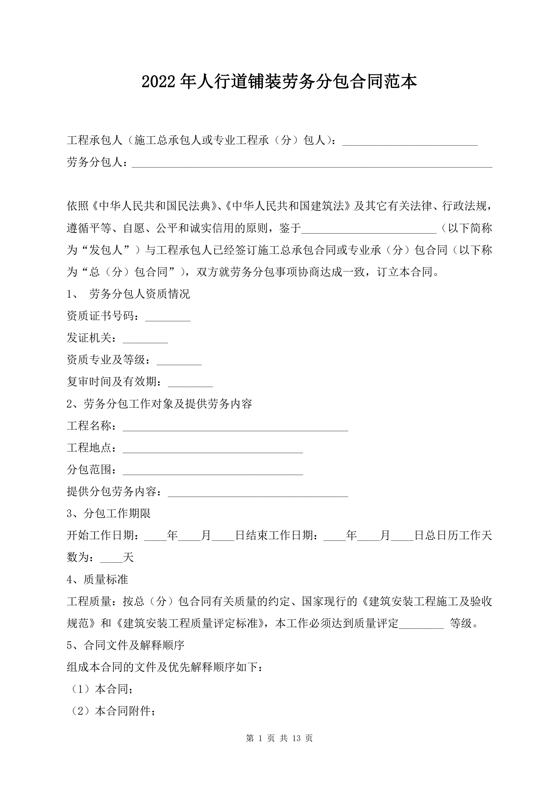 >2022年人行道铺装劳务分包合同范本