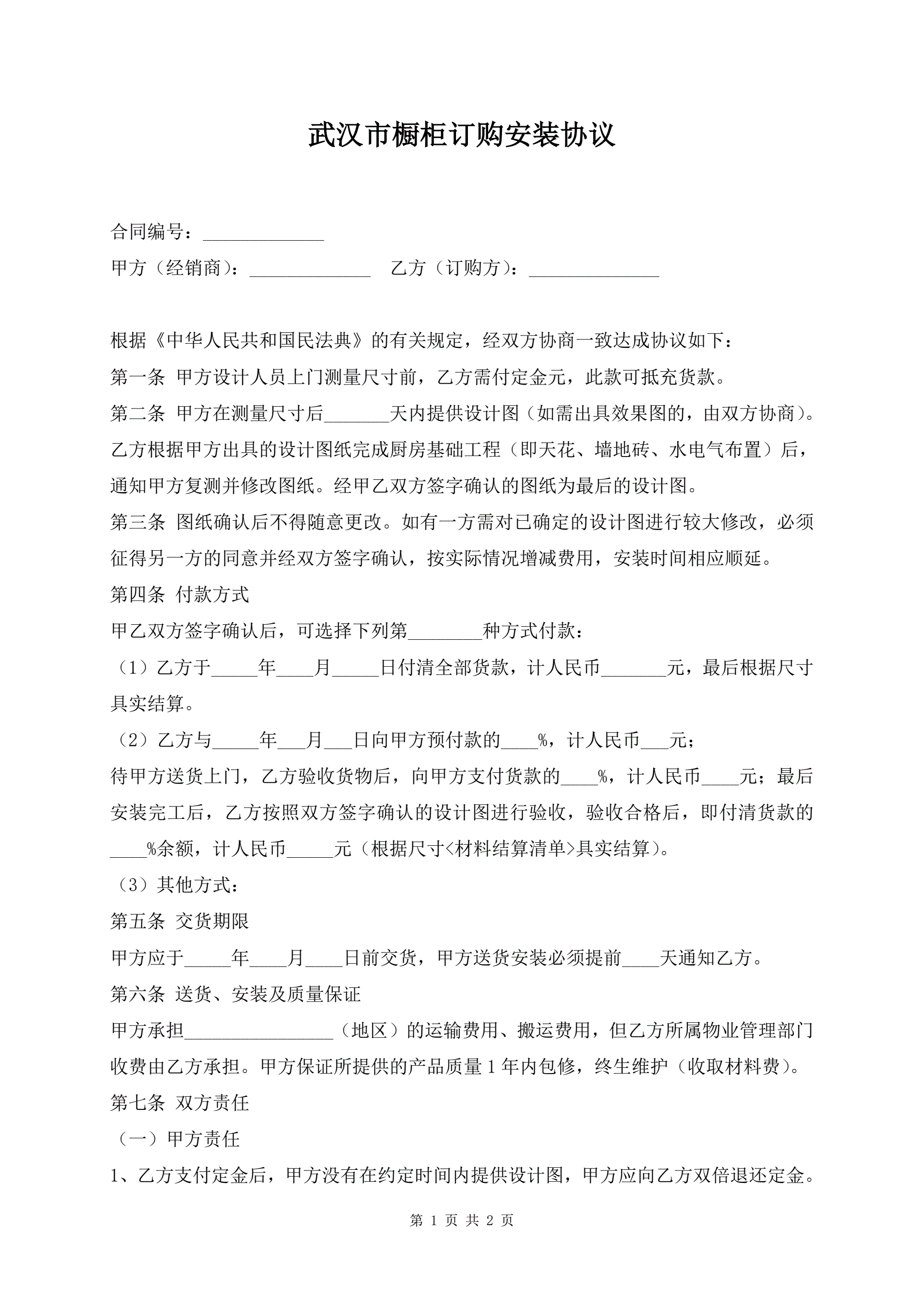 武汉市橱柜订购安装协议