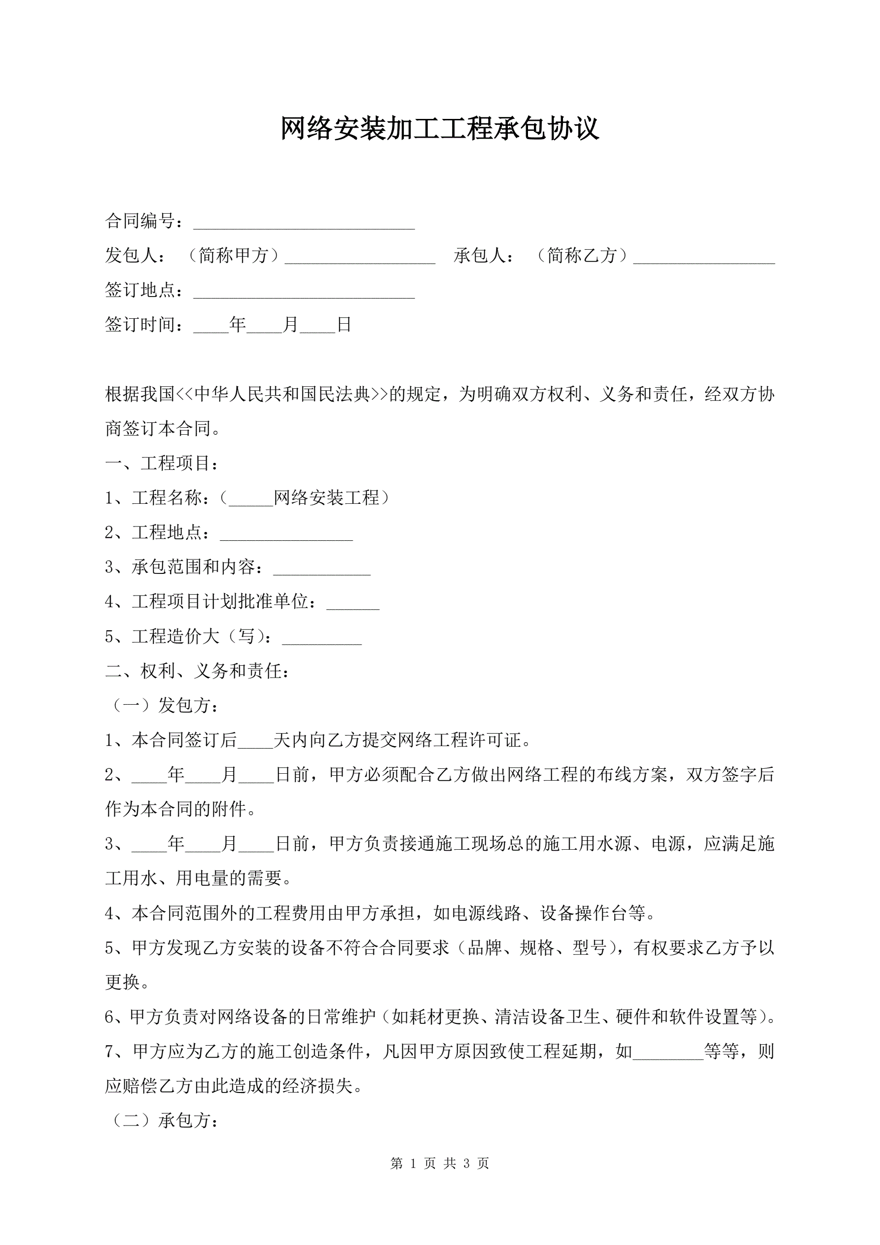>网络安装加工工程承包协议