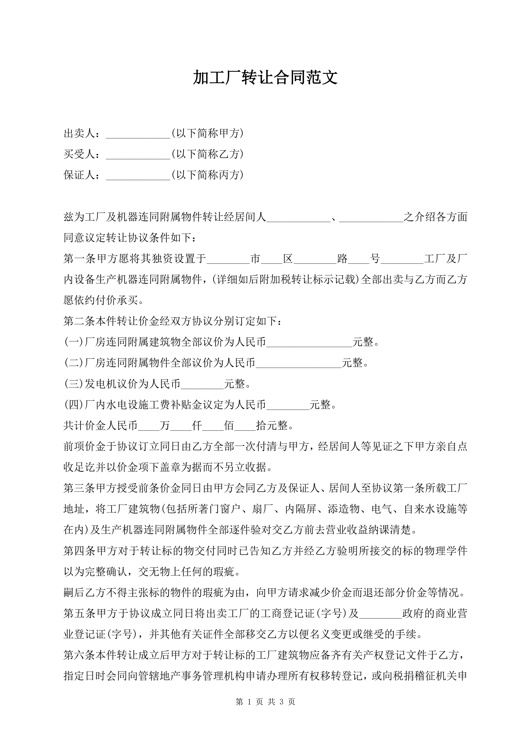 >加工厂转让合同范文