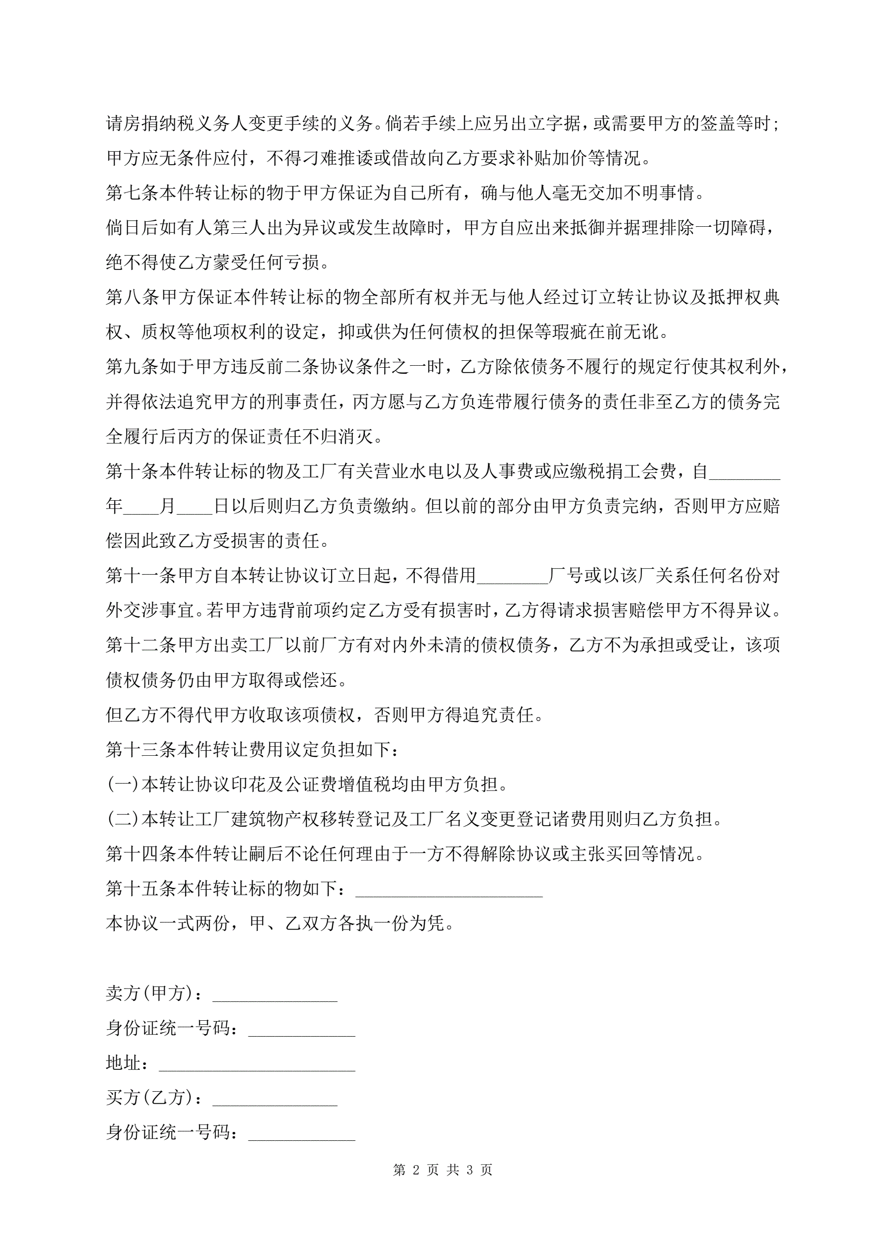 加工厂转让合同范文