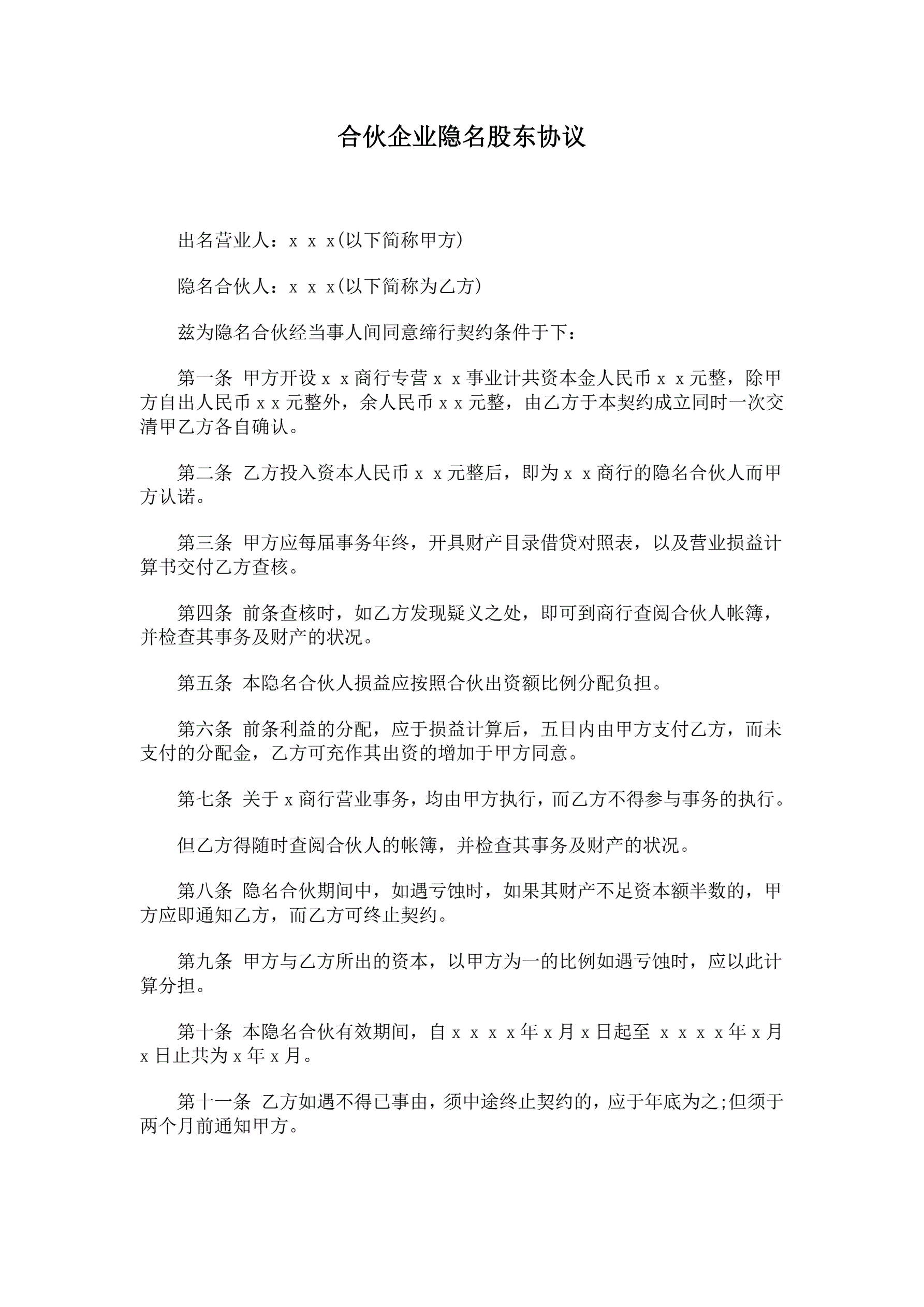 >合伙企业隐名股东协议