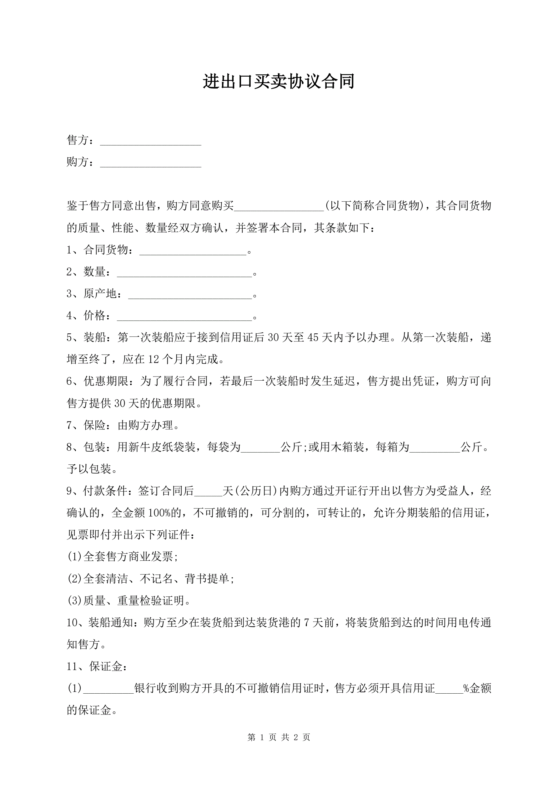 进出口买卖协议合同