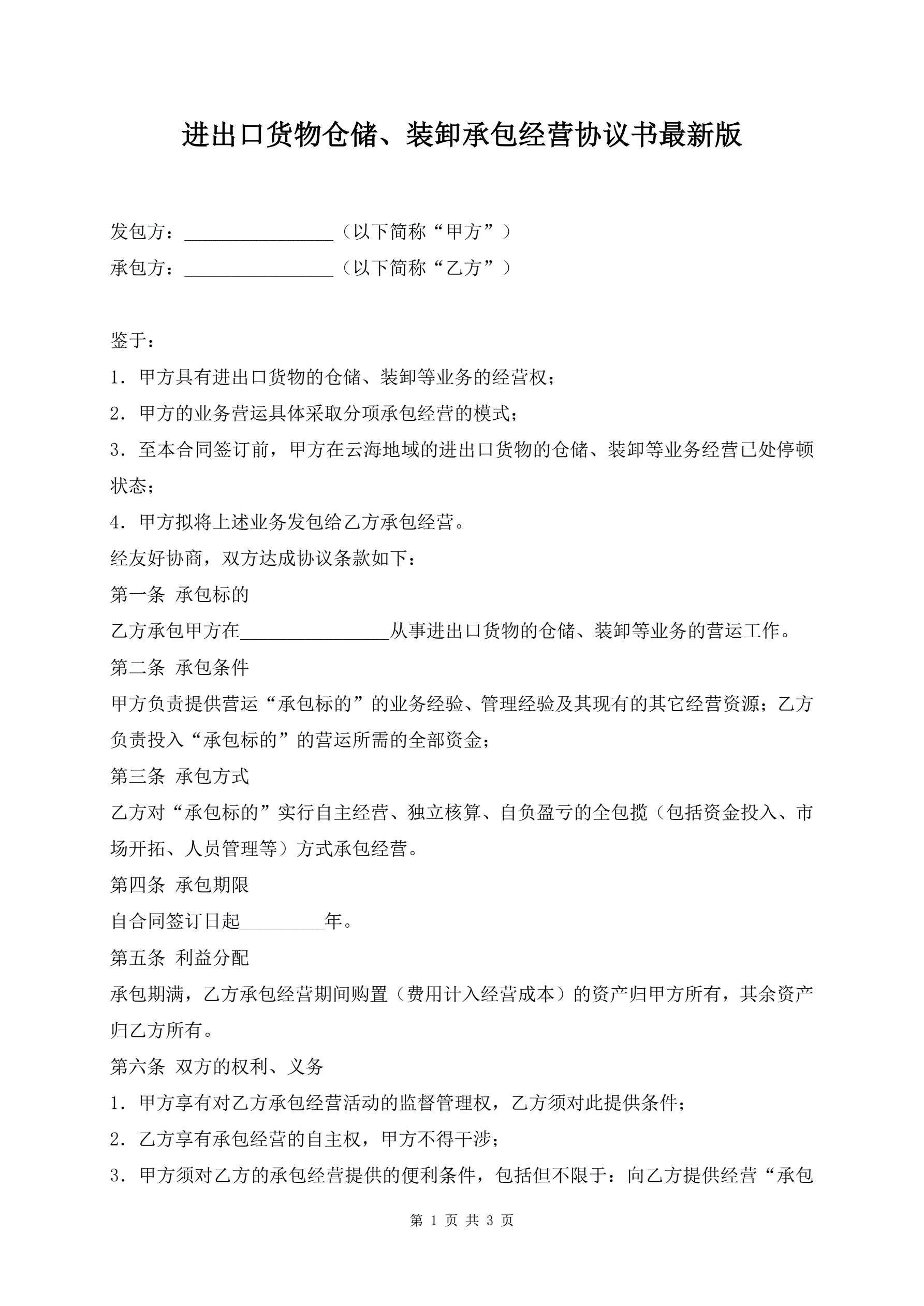 进出口货物仓储、装卸承包经营协议书最新版