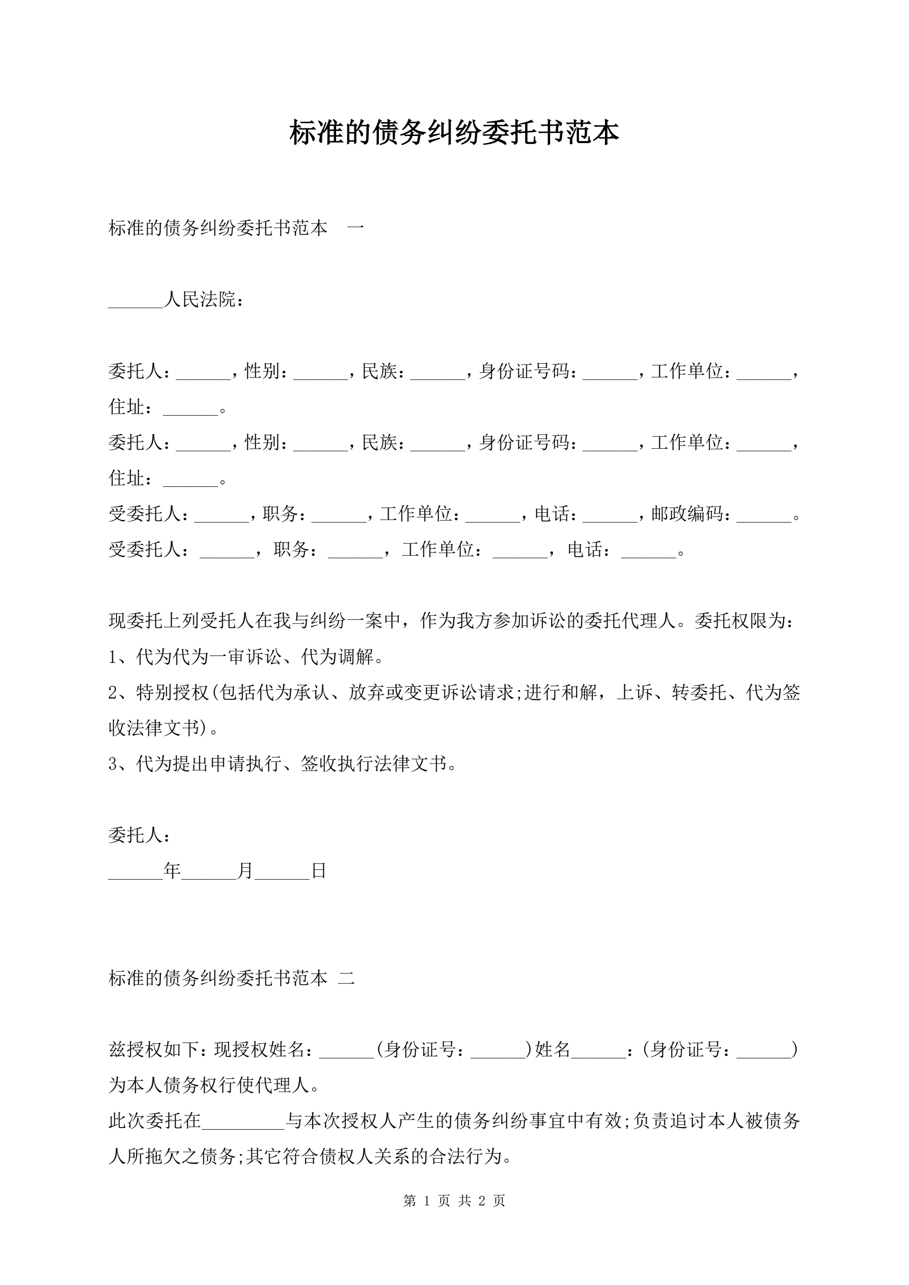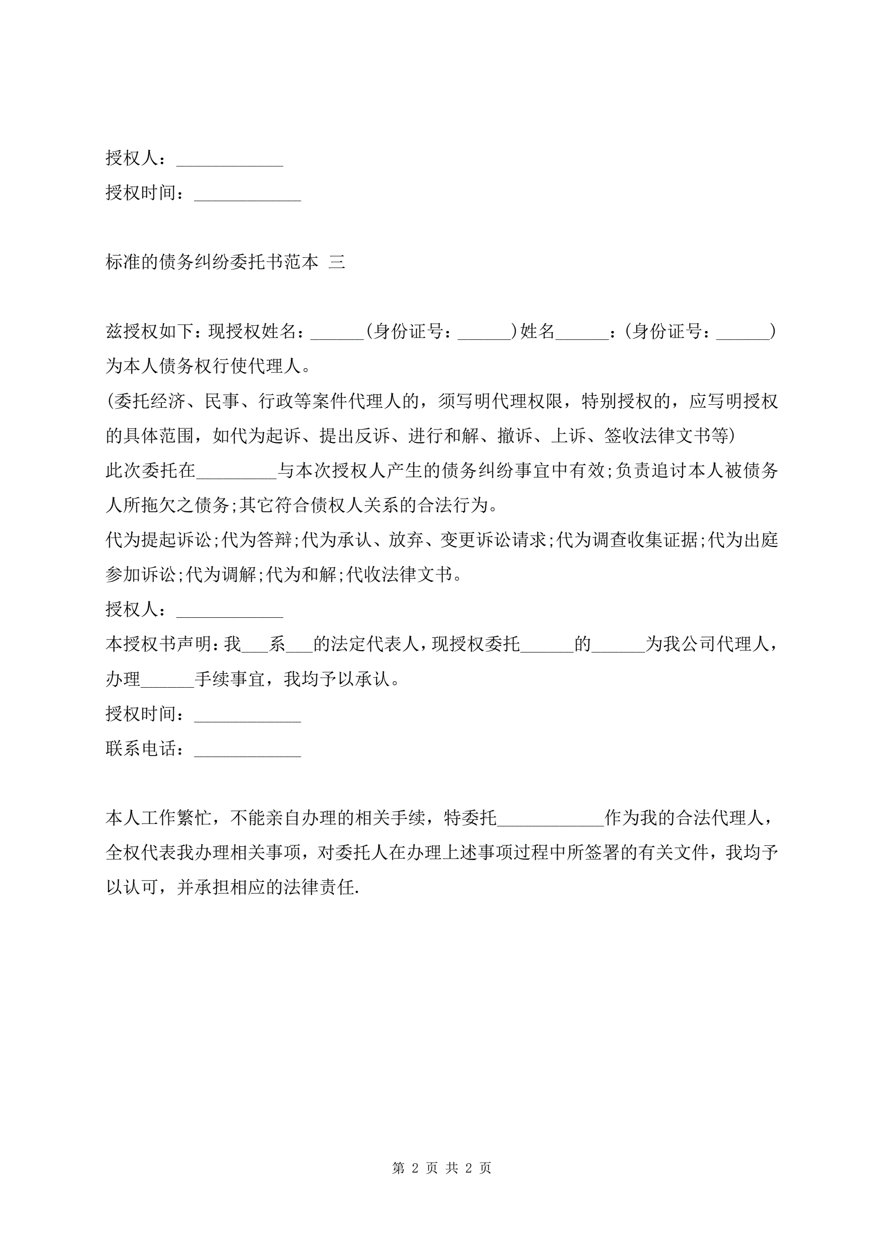 标准的债务纠纷委托书范本