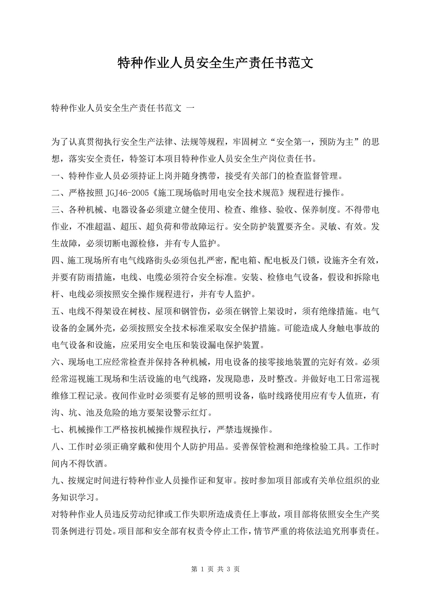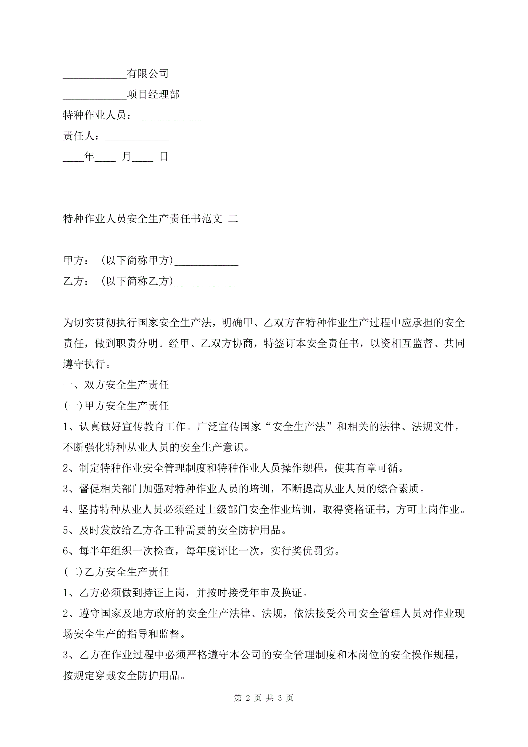 特种作业人员安全生产责任书范文