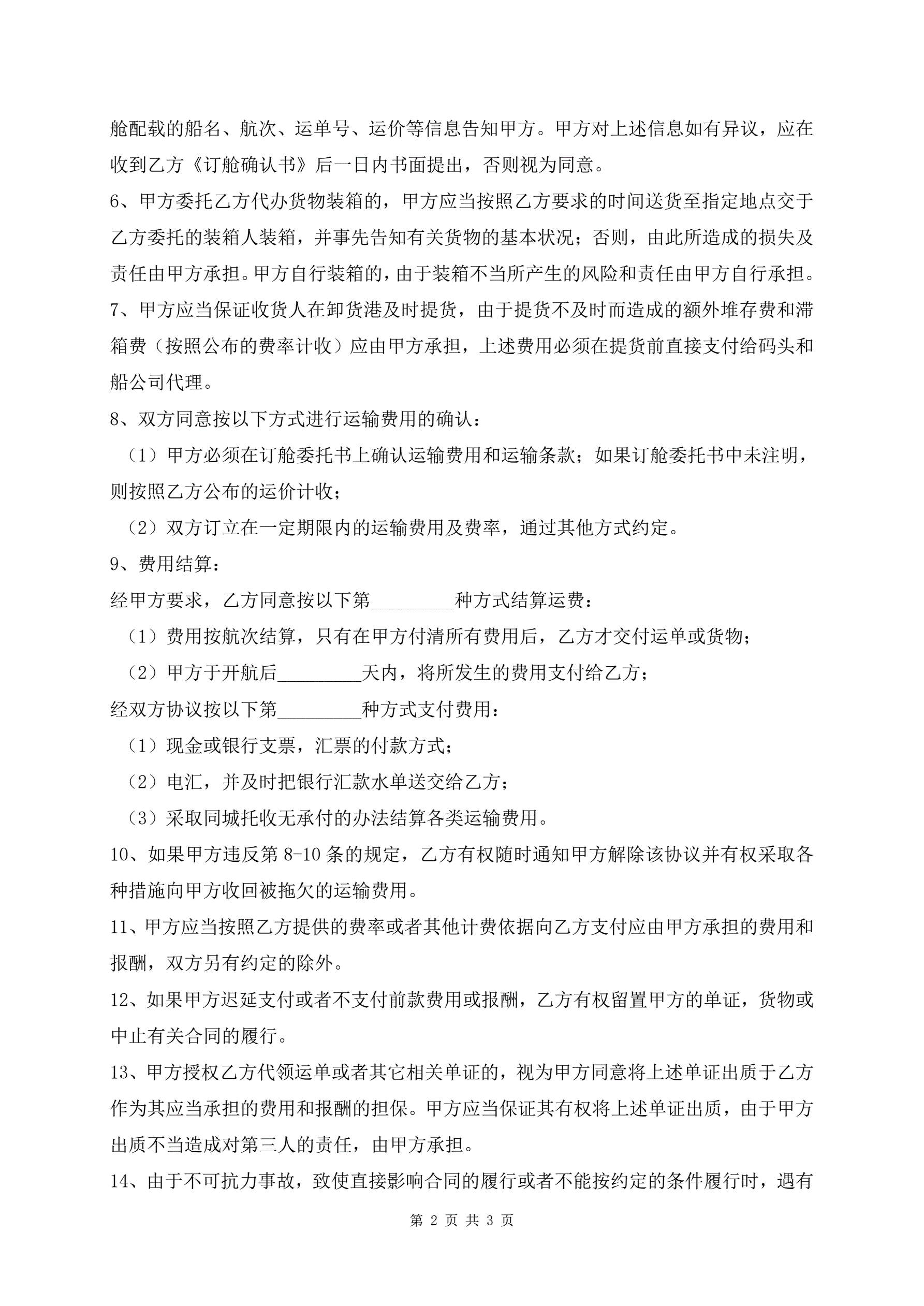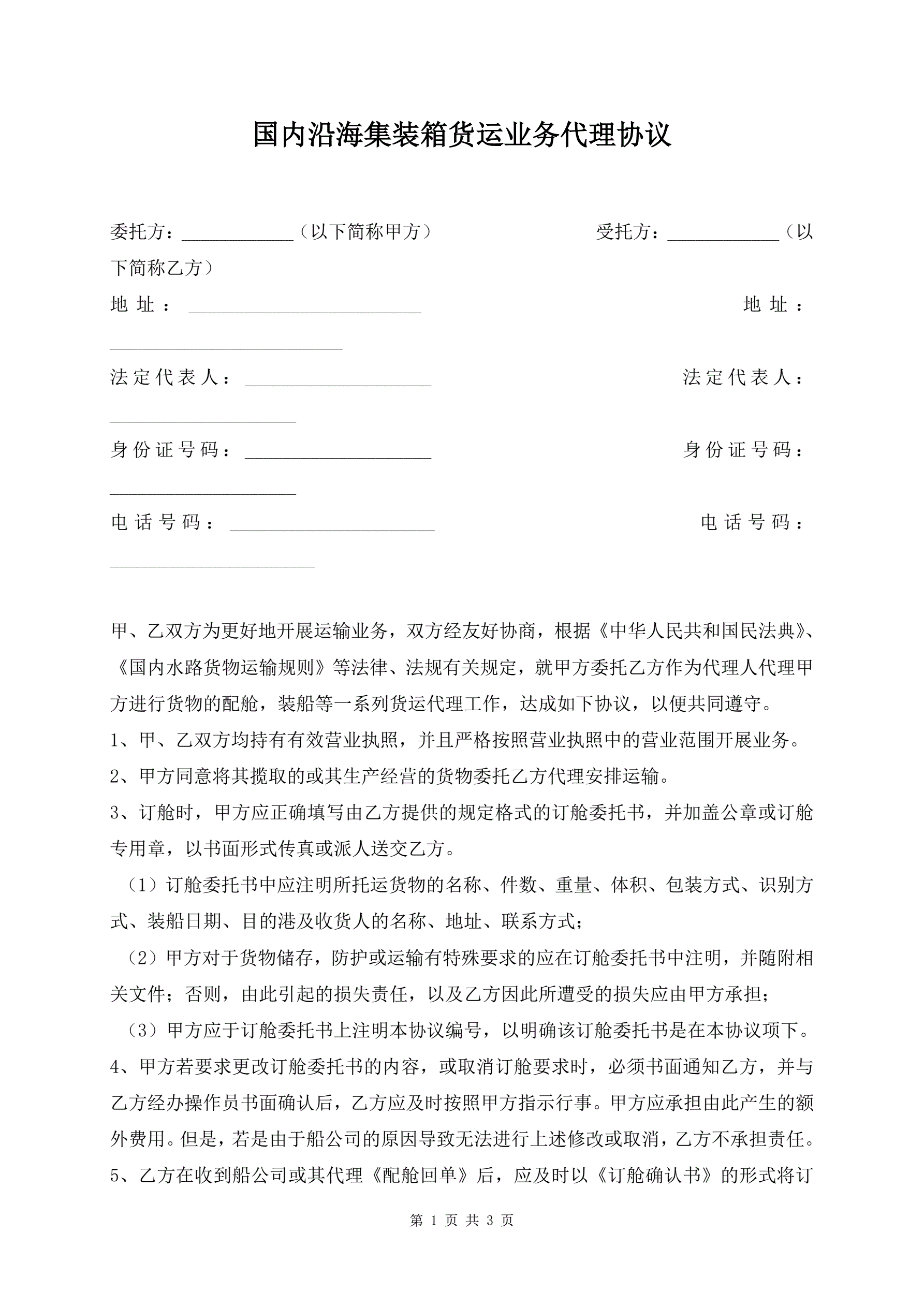 >国内沿海集装箱货运业务代理协议