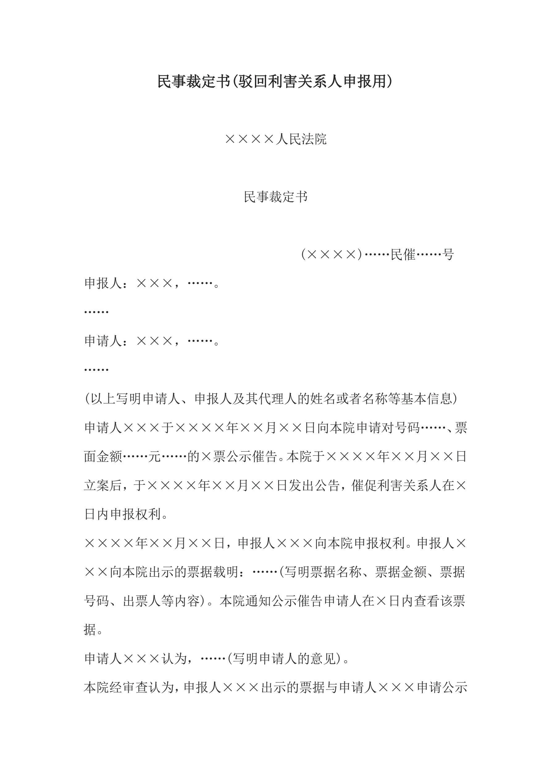 >民事裁定书(驳回利害关系人申报用)