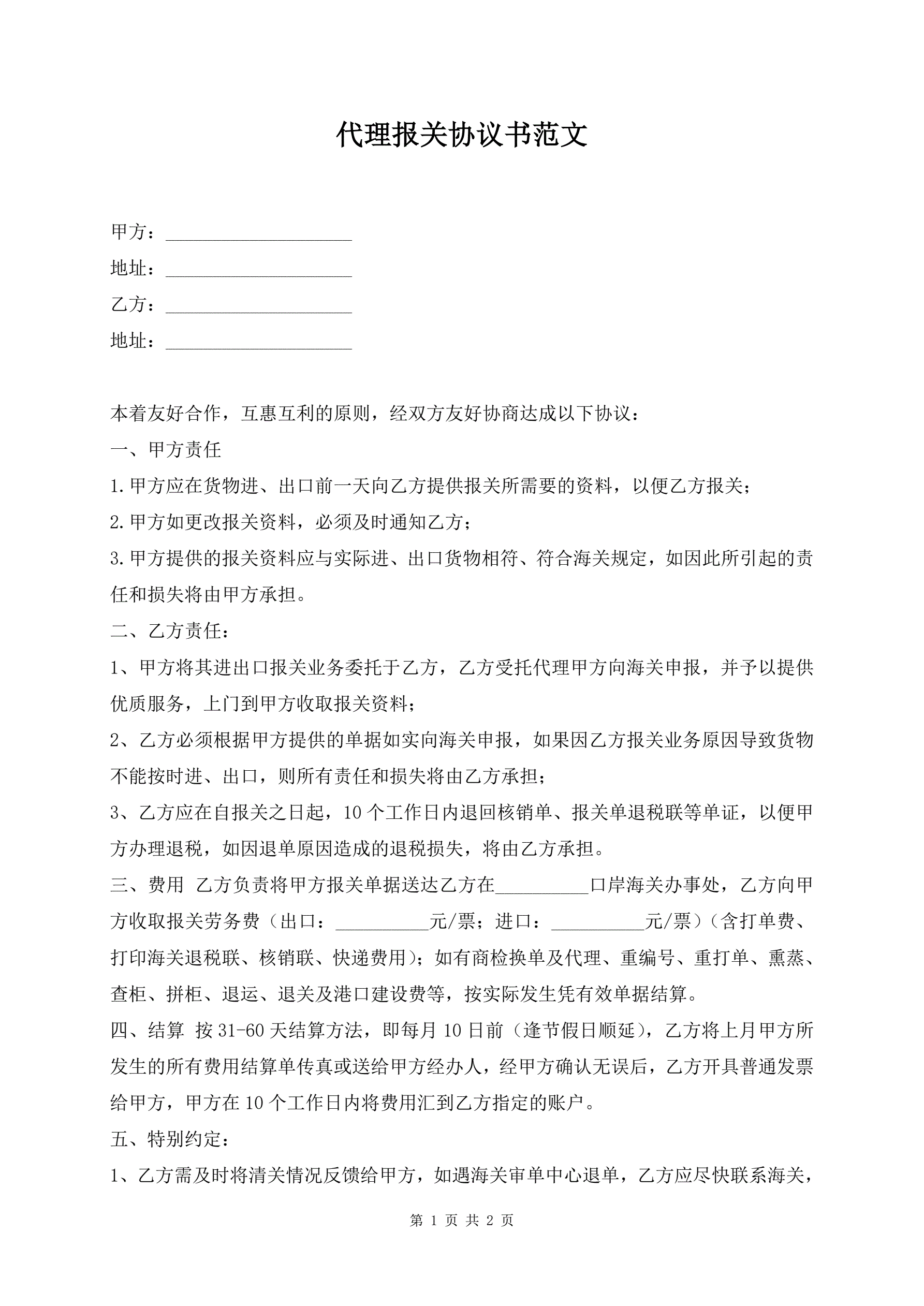 代理报关协议书范文
