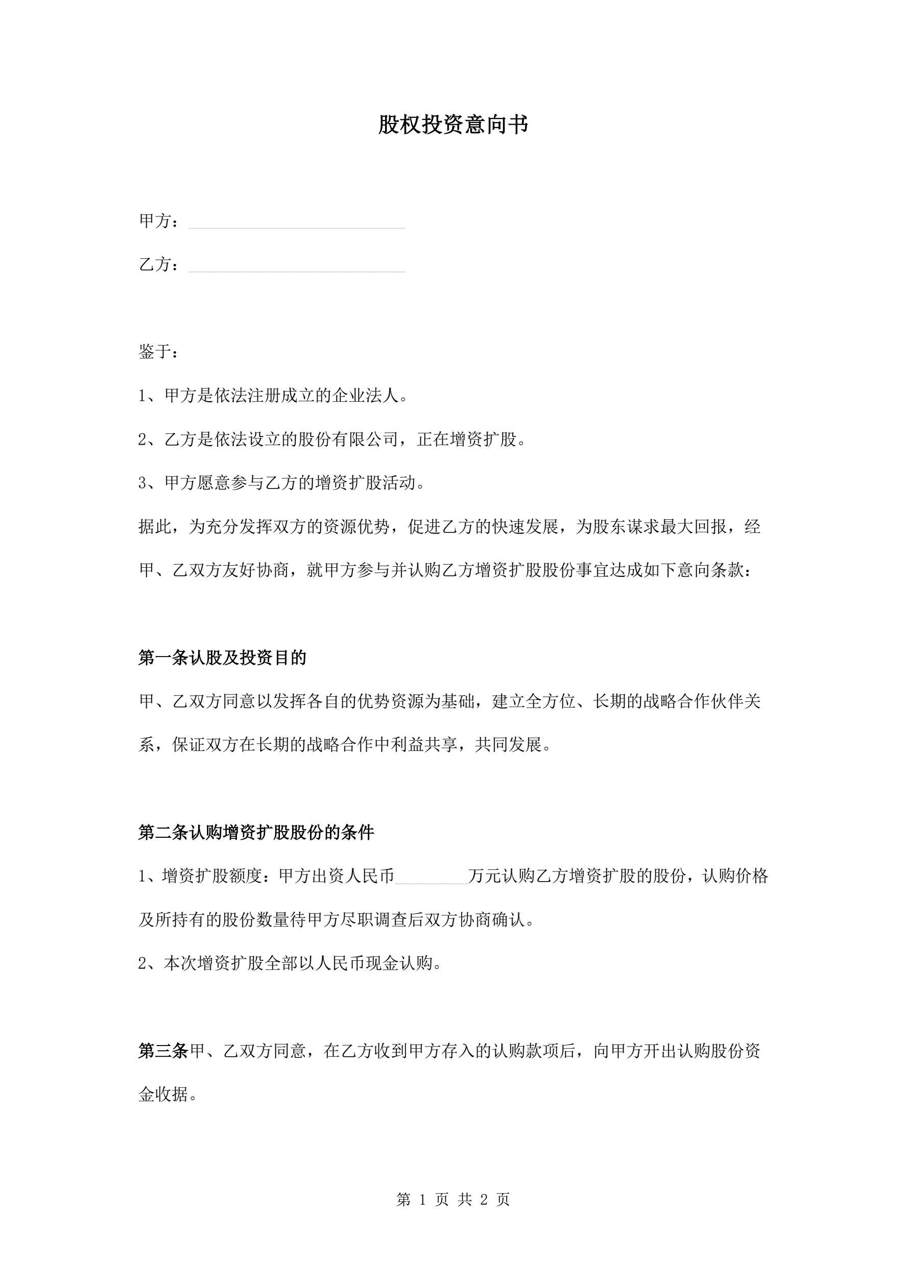 股权投资意向书(简单版)(指导版)
