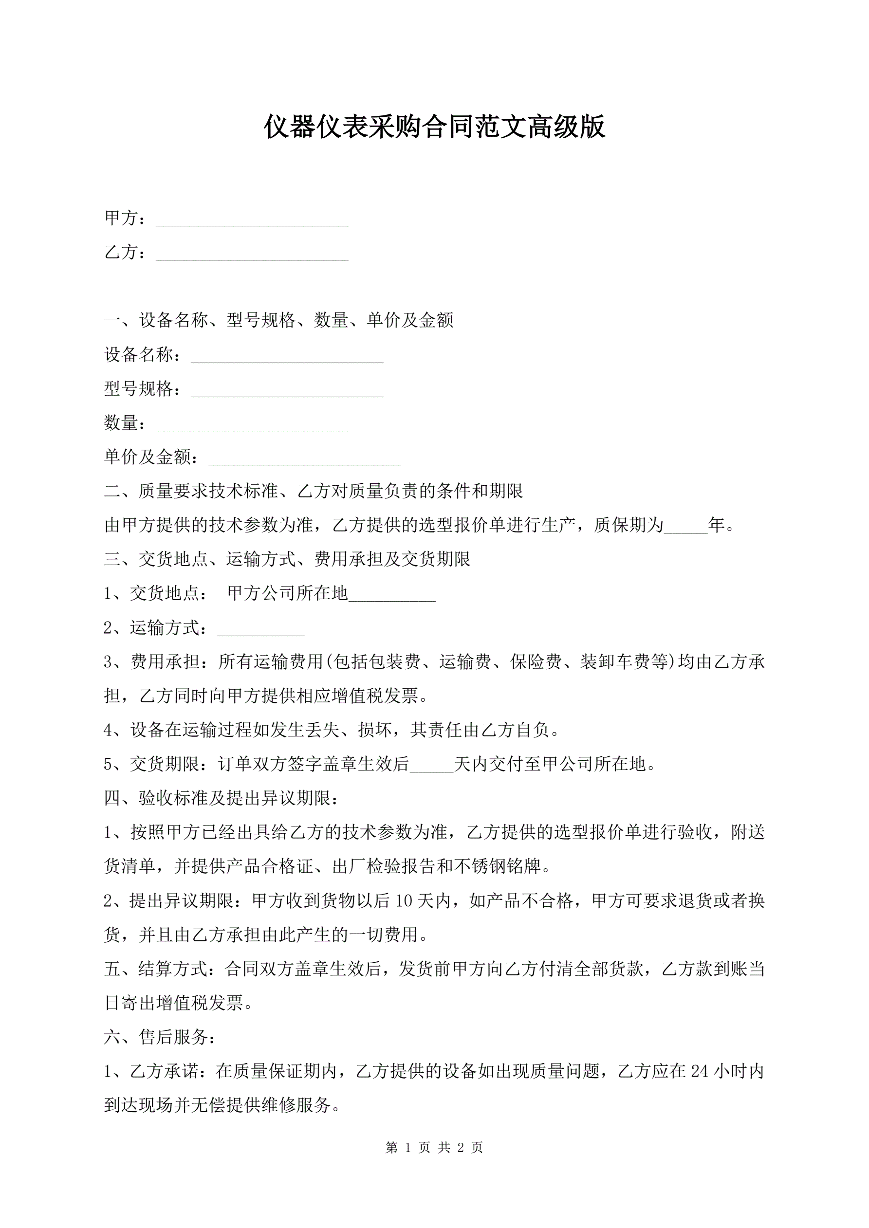 仪器仪表采购合同范文高级版