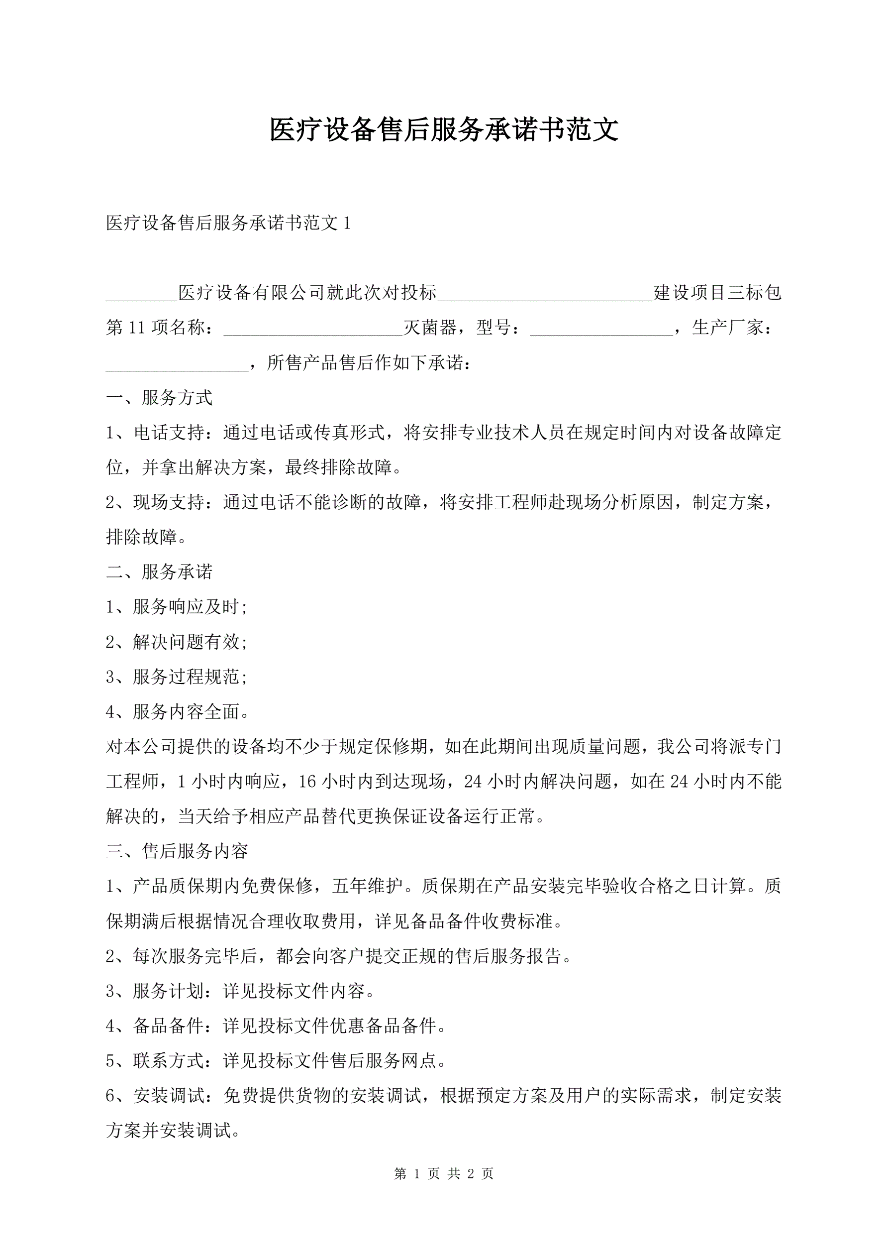 >医疗设备售后服务承诺书范文