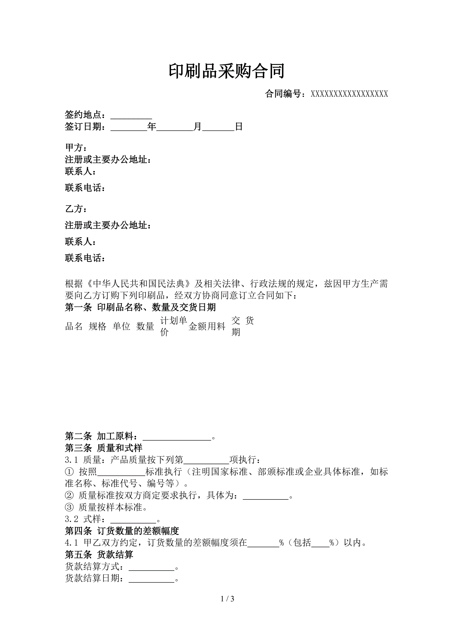 印刷品采购合同
