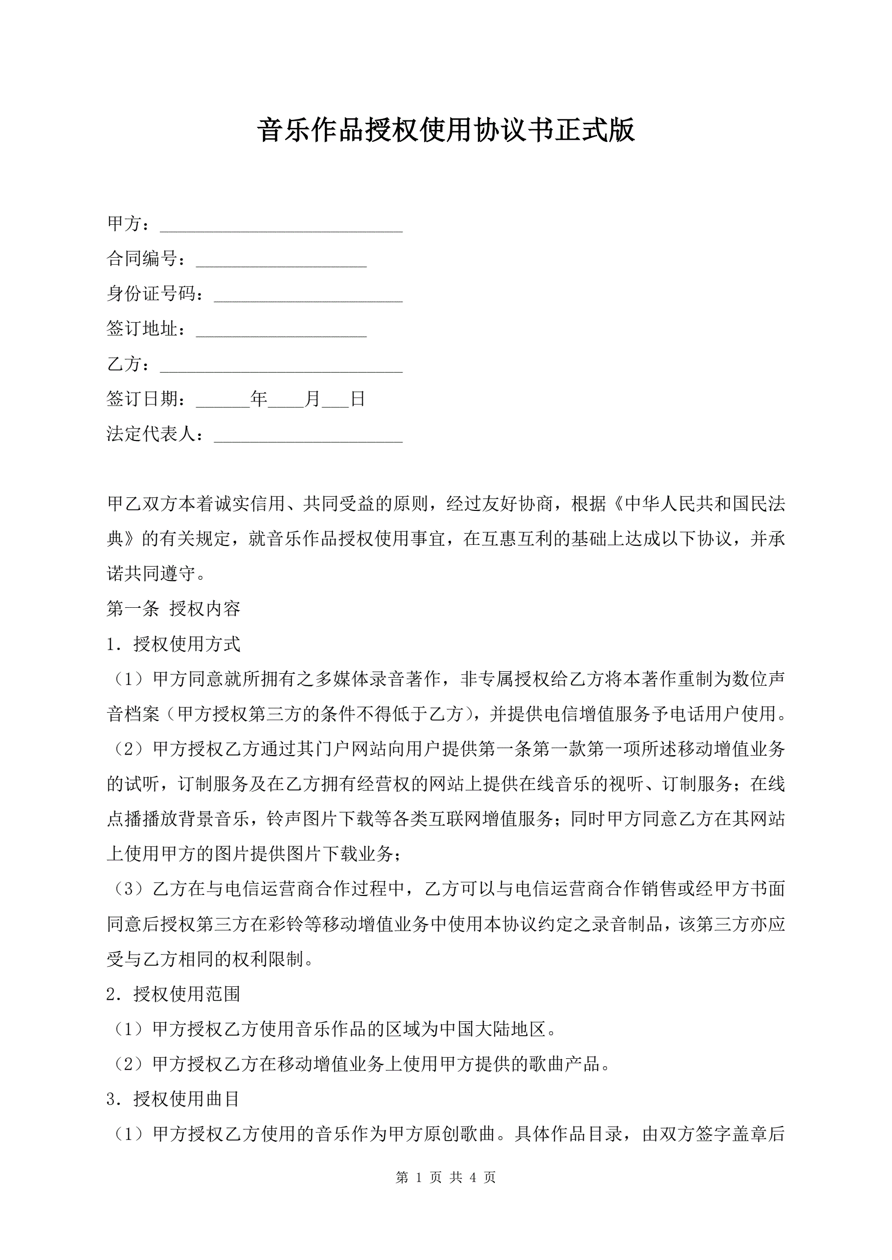 >音乐作品授权使用协议书正式版