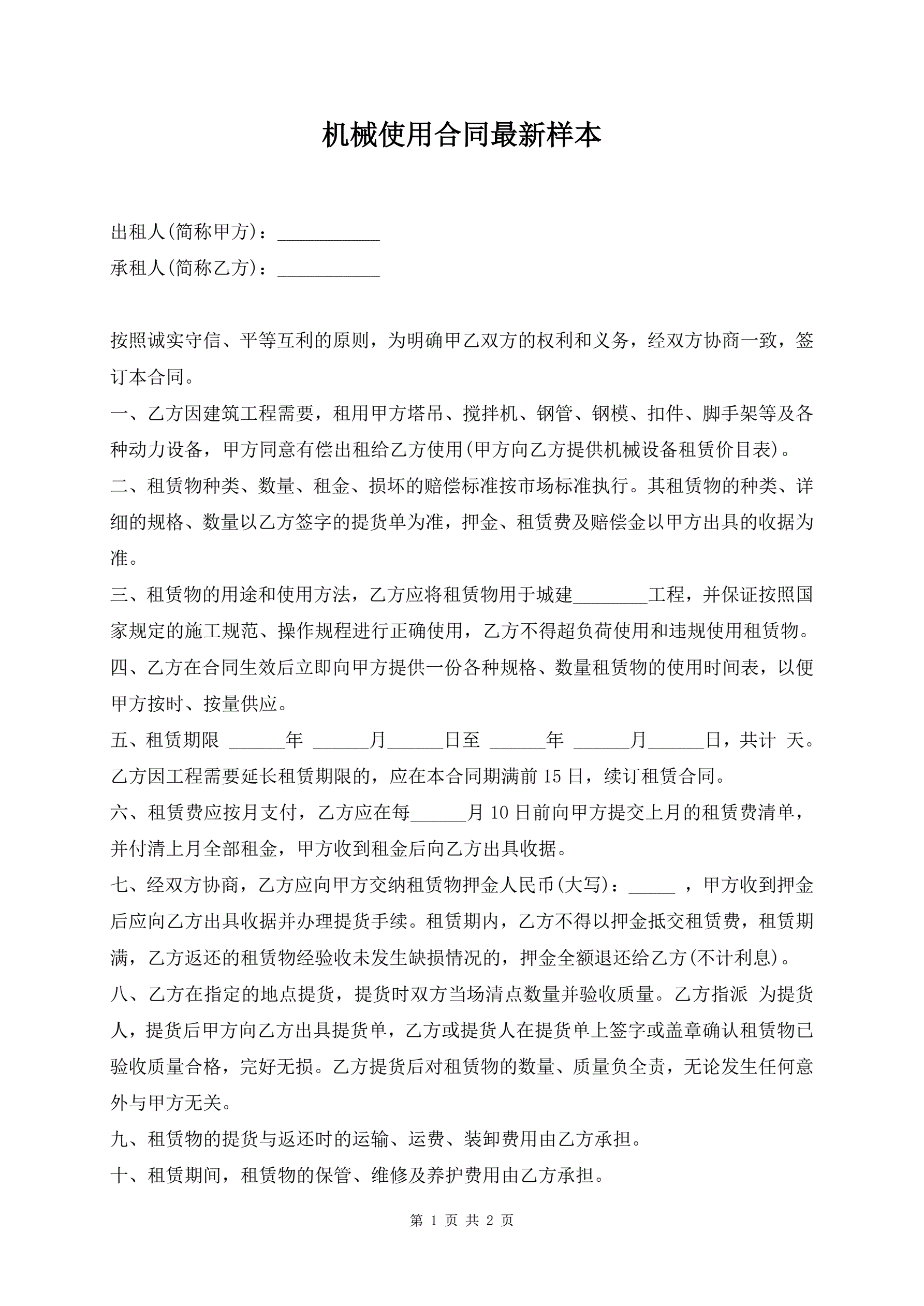 机械使用合同最新样本