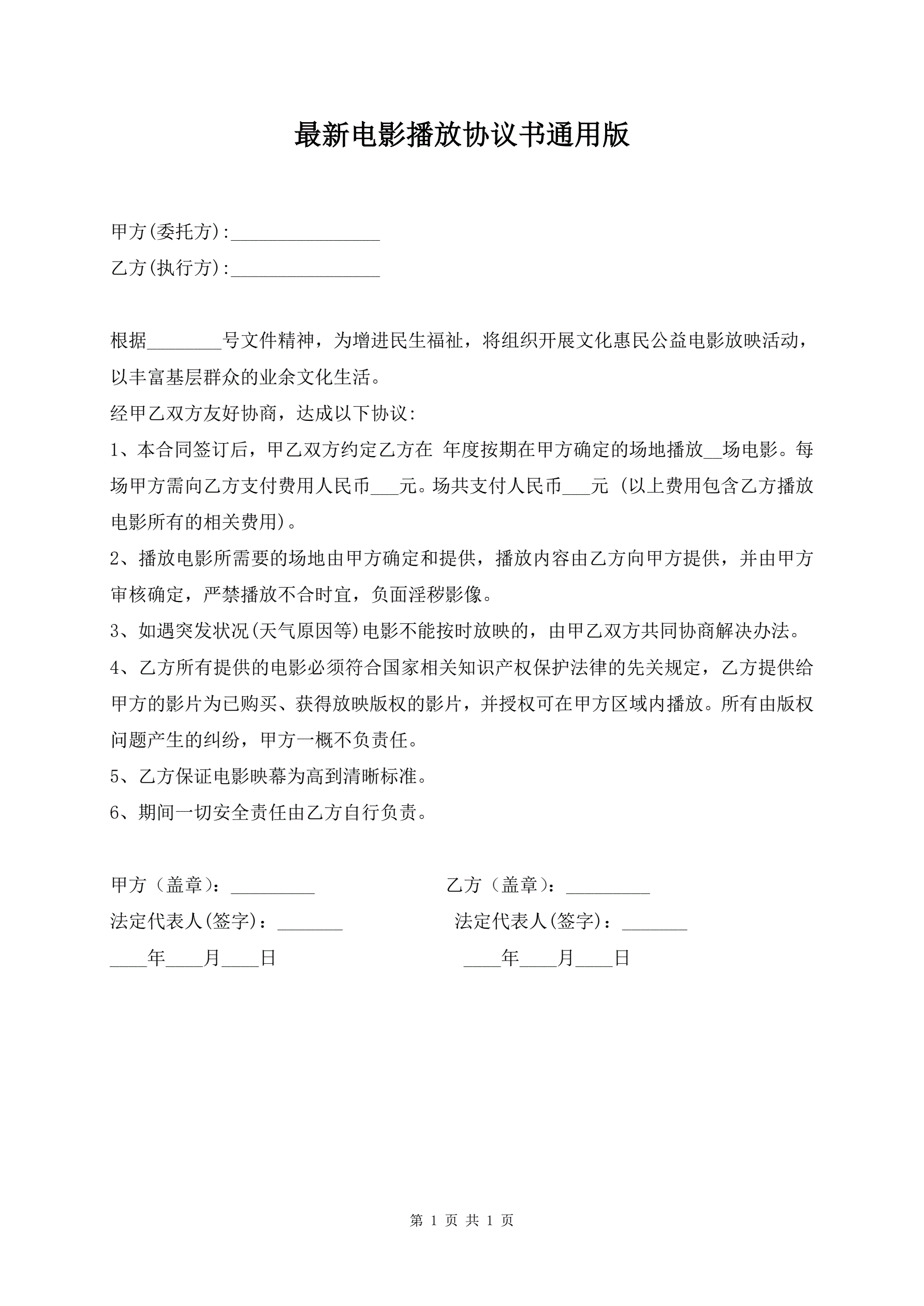 最新电影播放协议书通用版