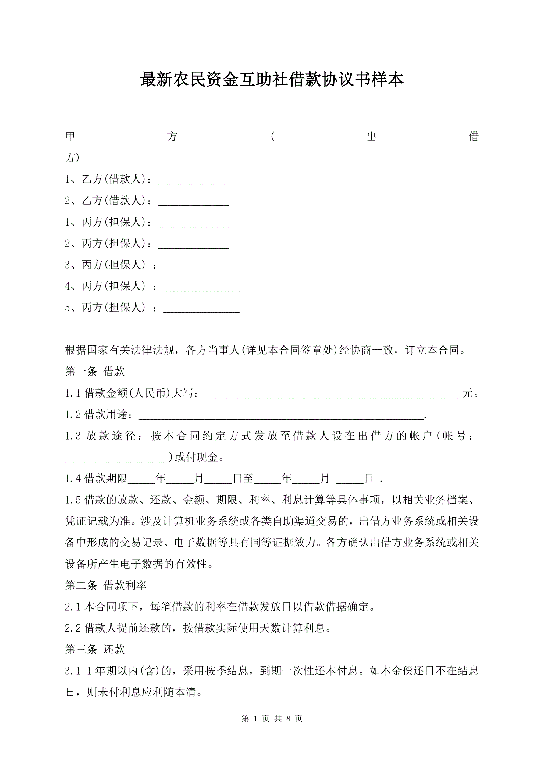 最新农民资金互助社借款协议书样本