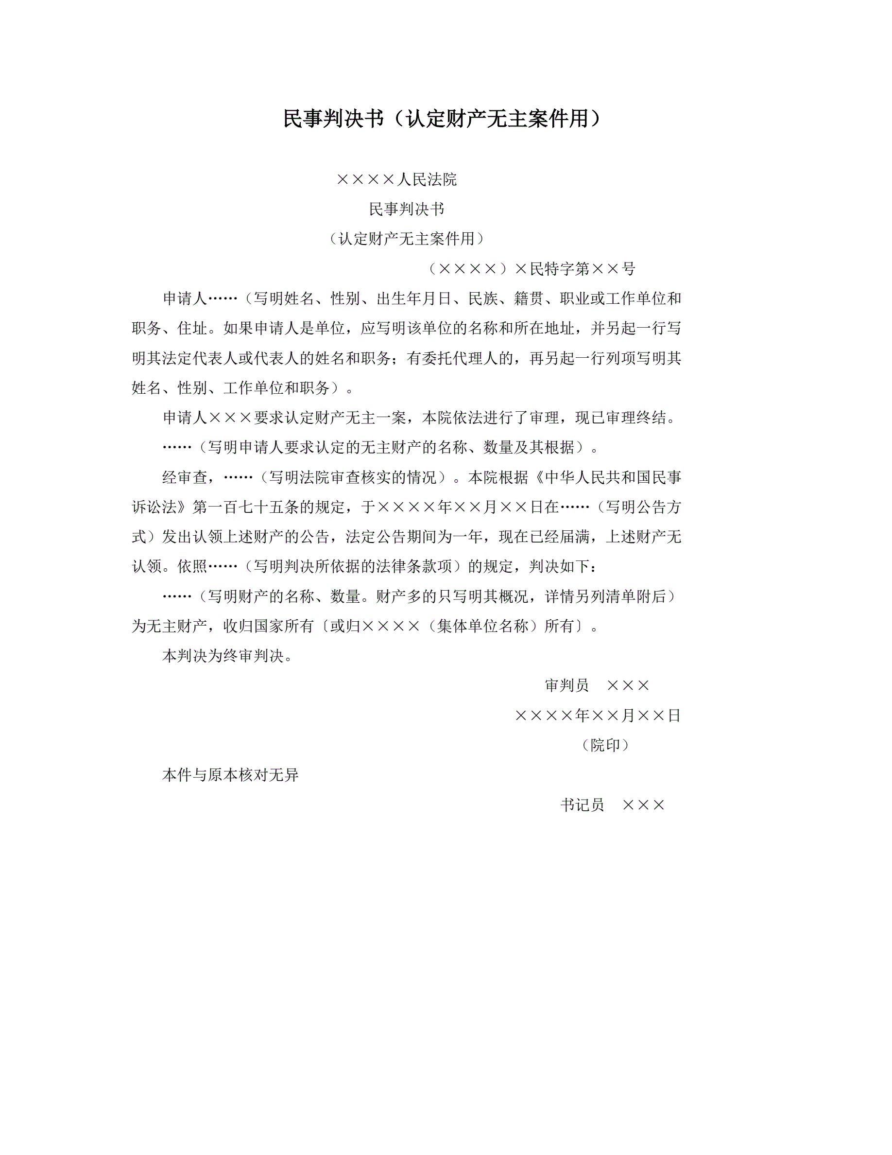 民事判决书(认定财产无主案件用)