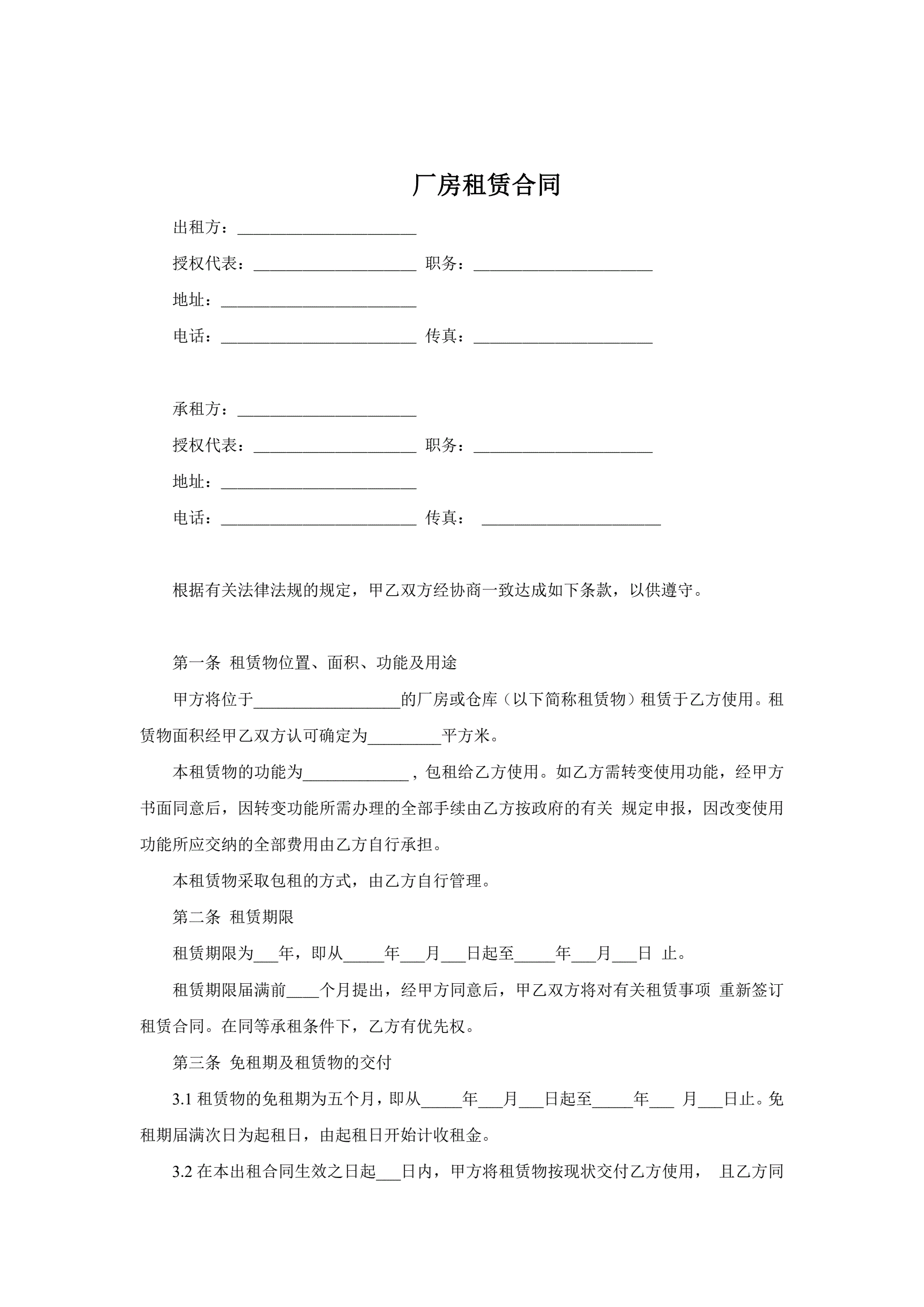 厂房(仓库)租赁合同