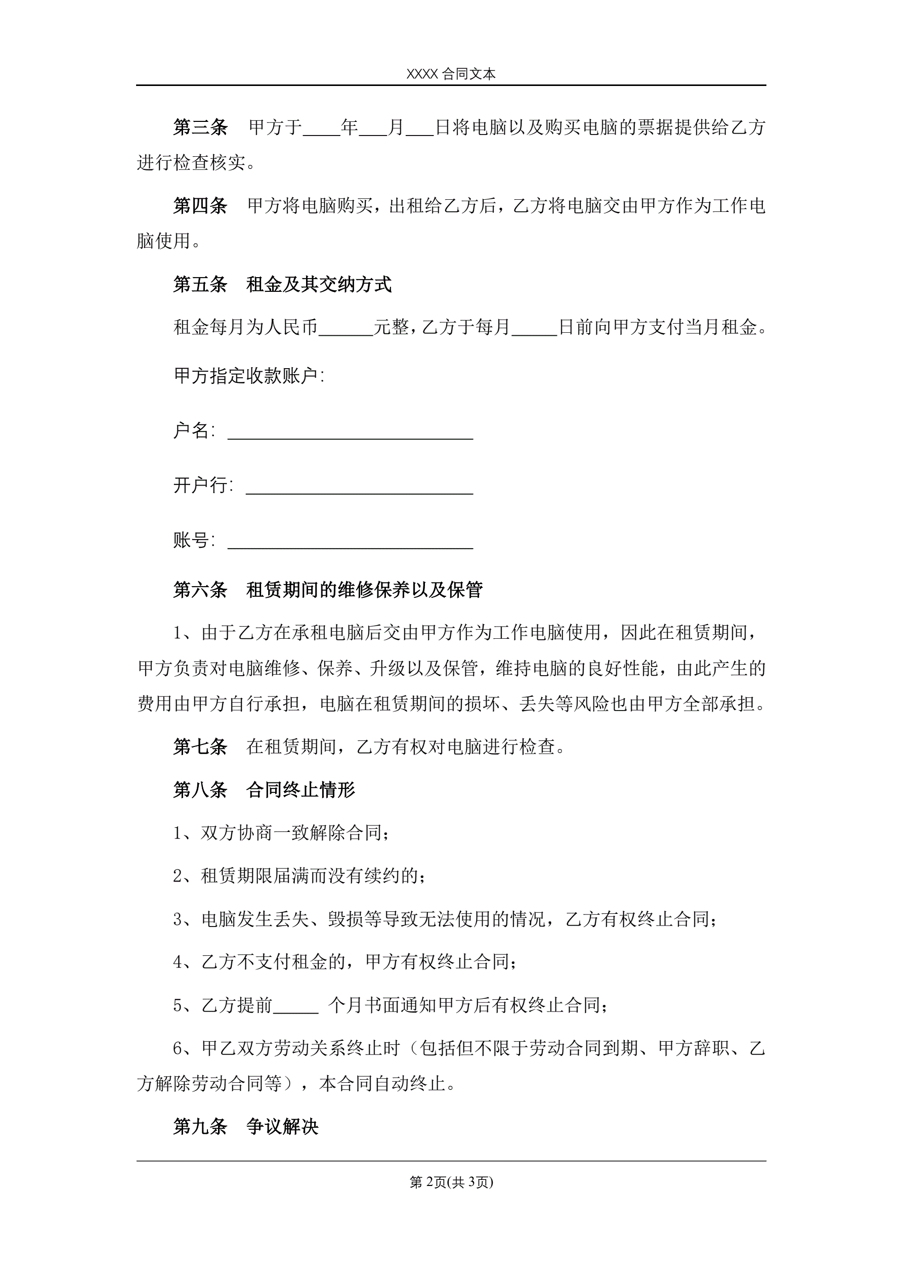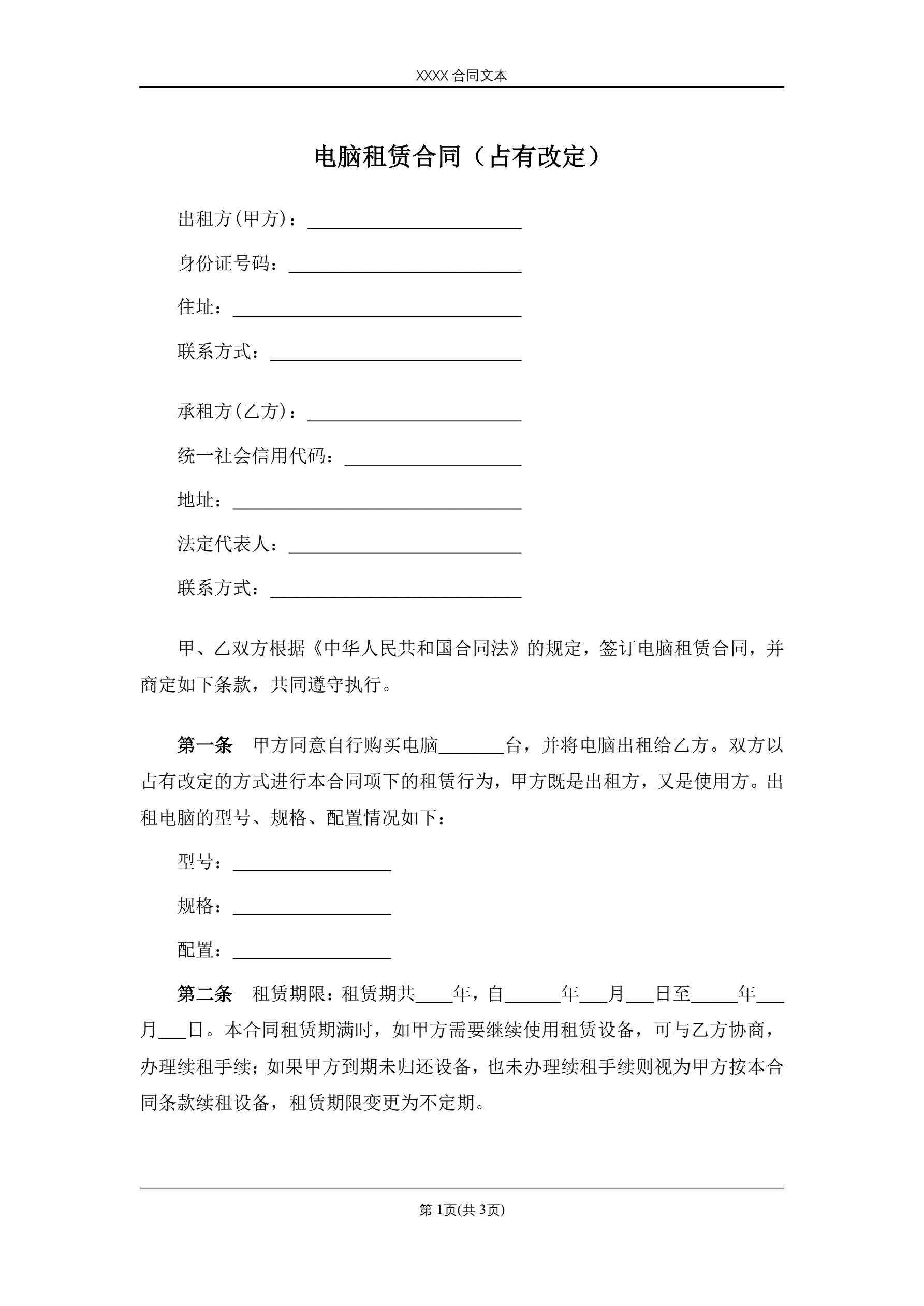 >电脑租赁合同(占有改定)
