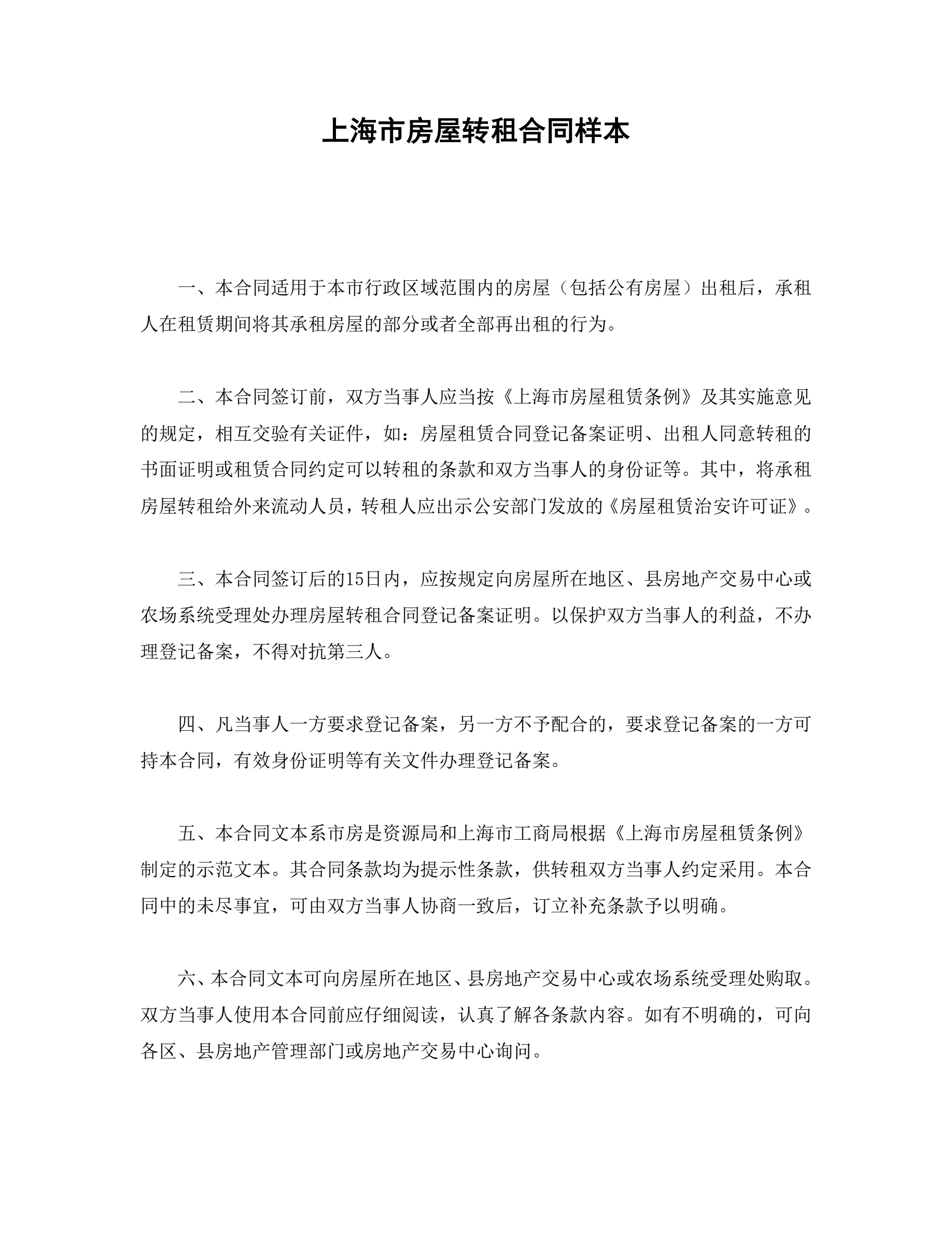 >上海市房屋转租合同样本