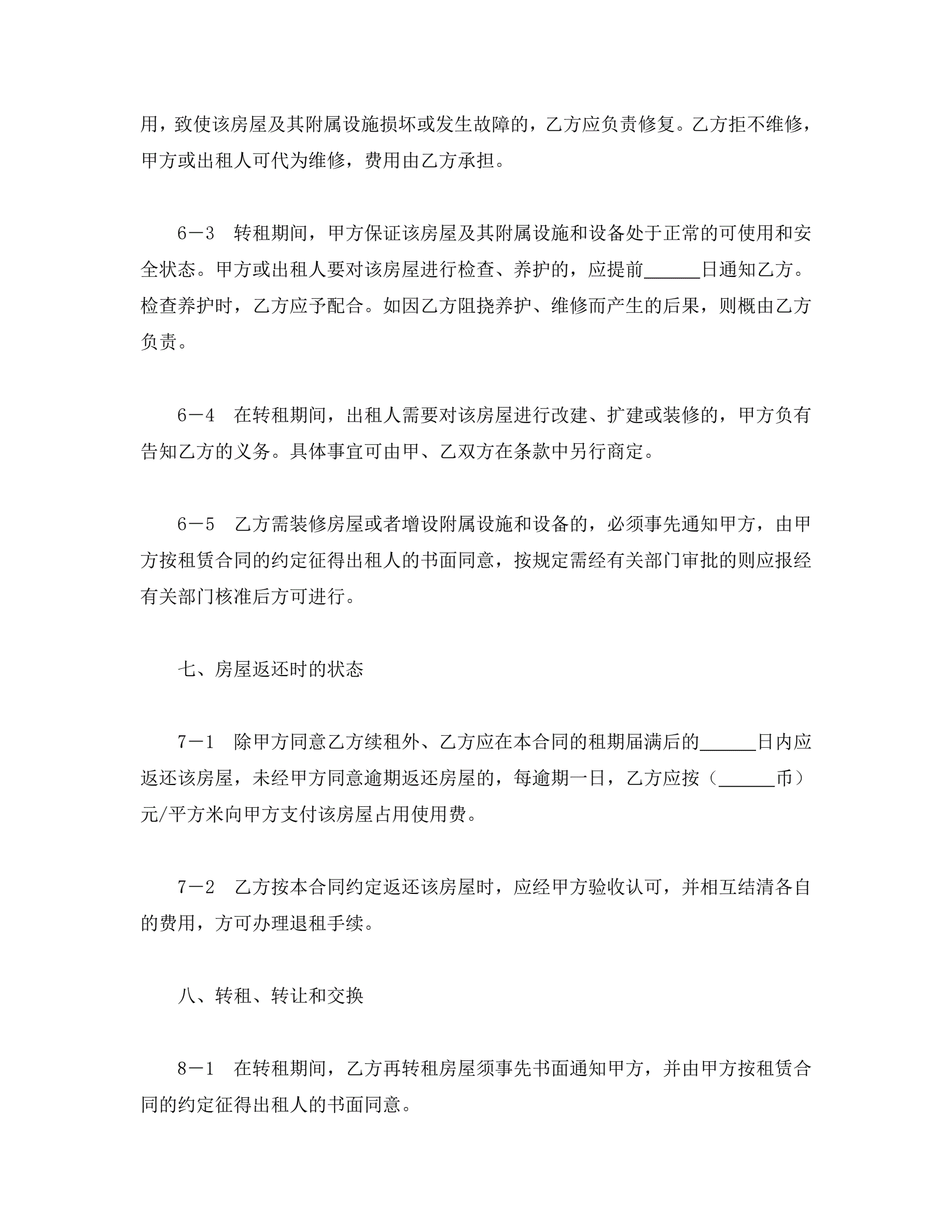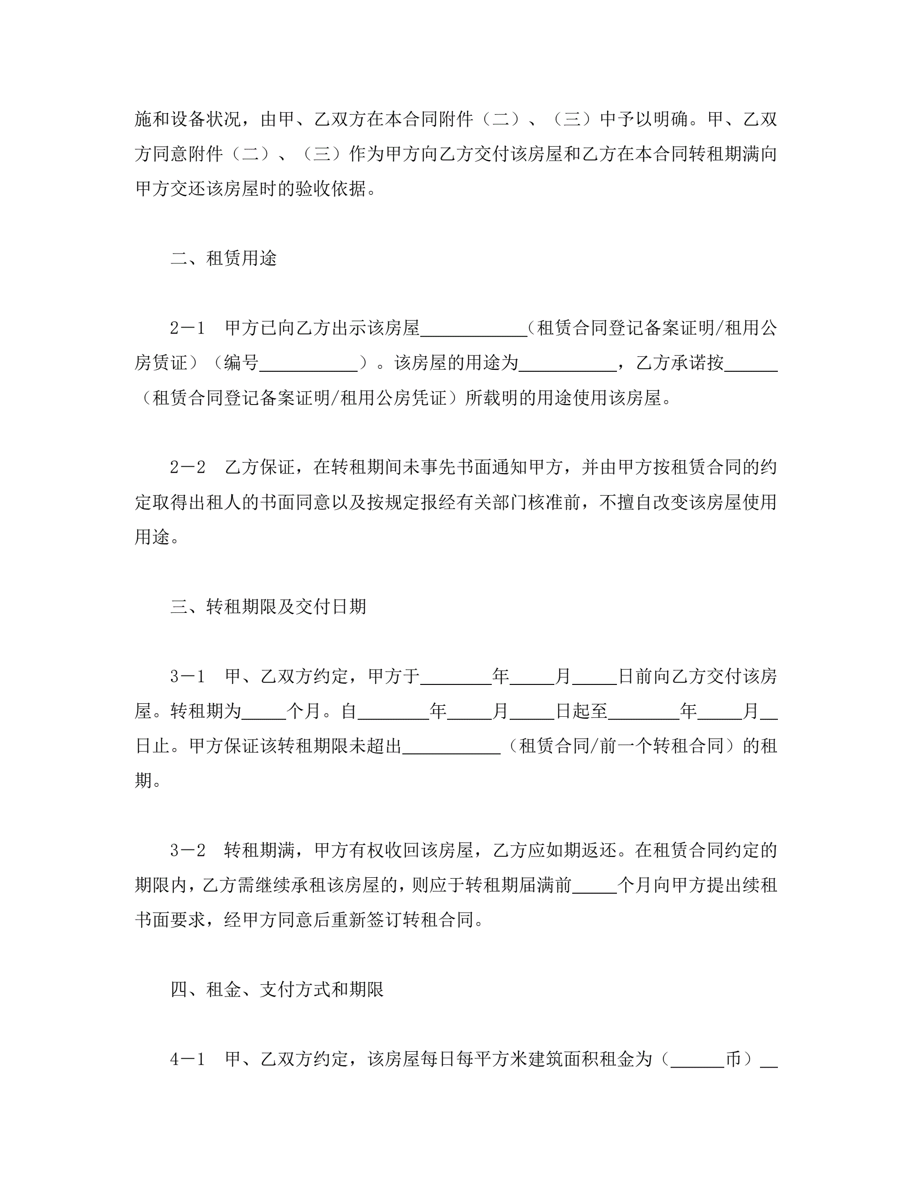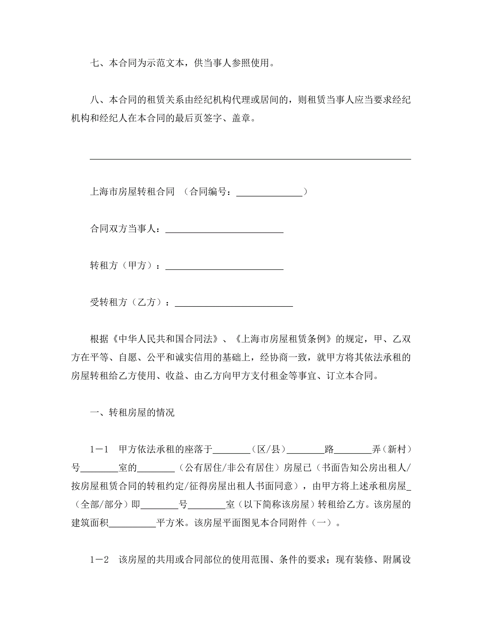 上海市房屋转租合同样本