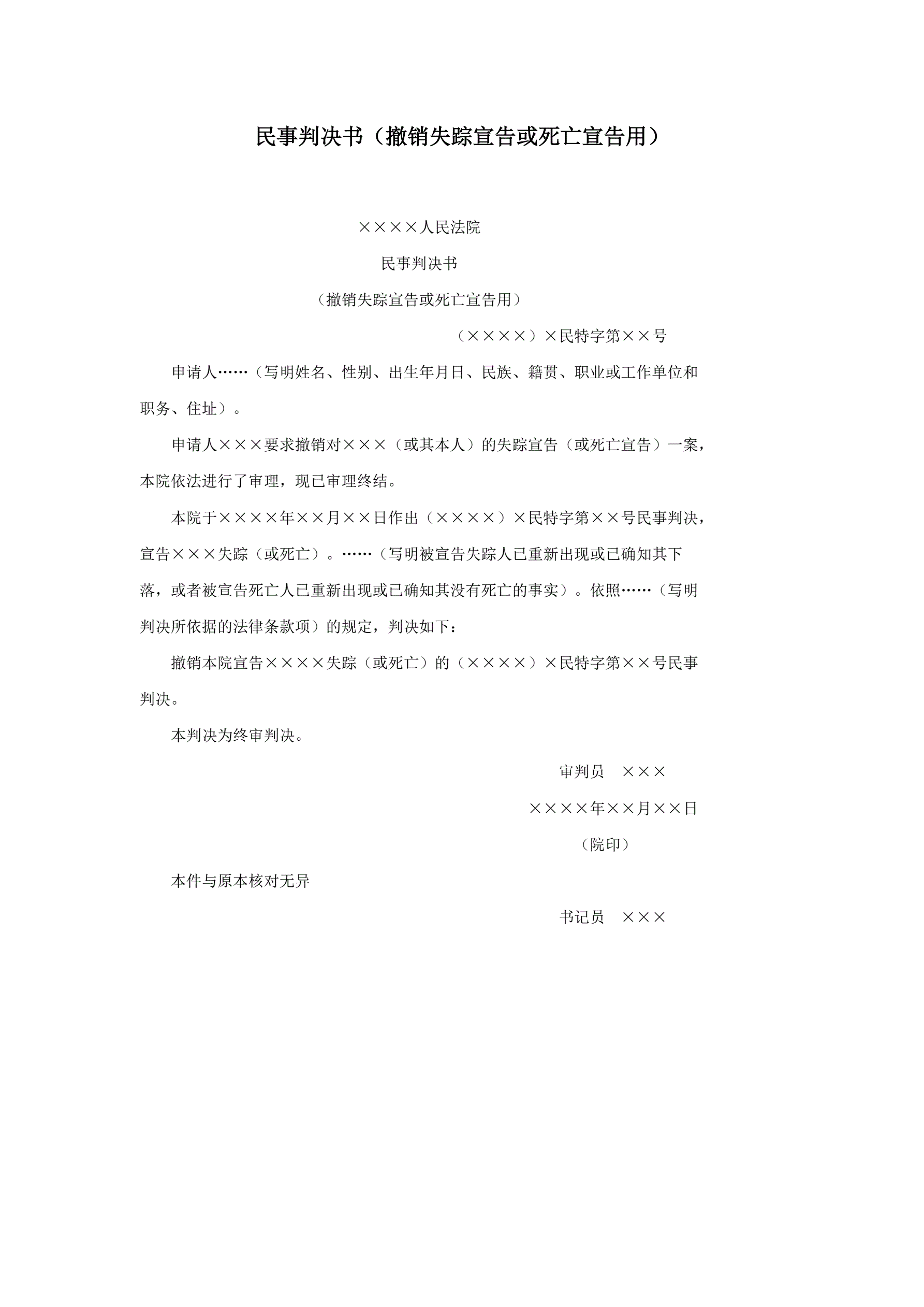 民事判决书(撤销失踪宣告或死亡宣告用)