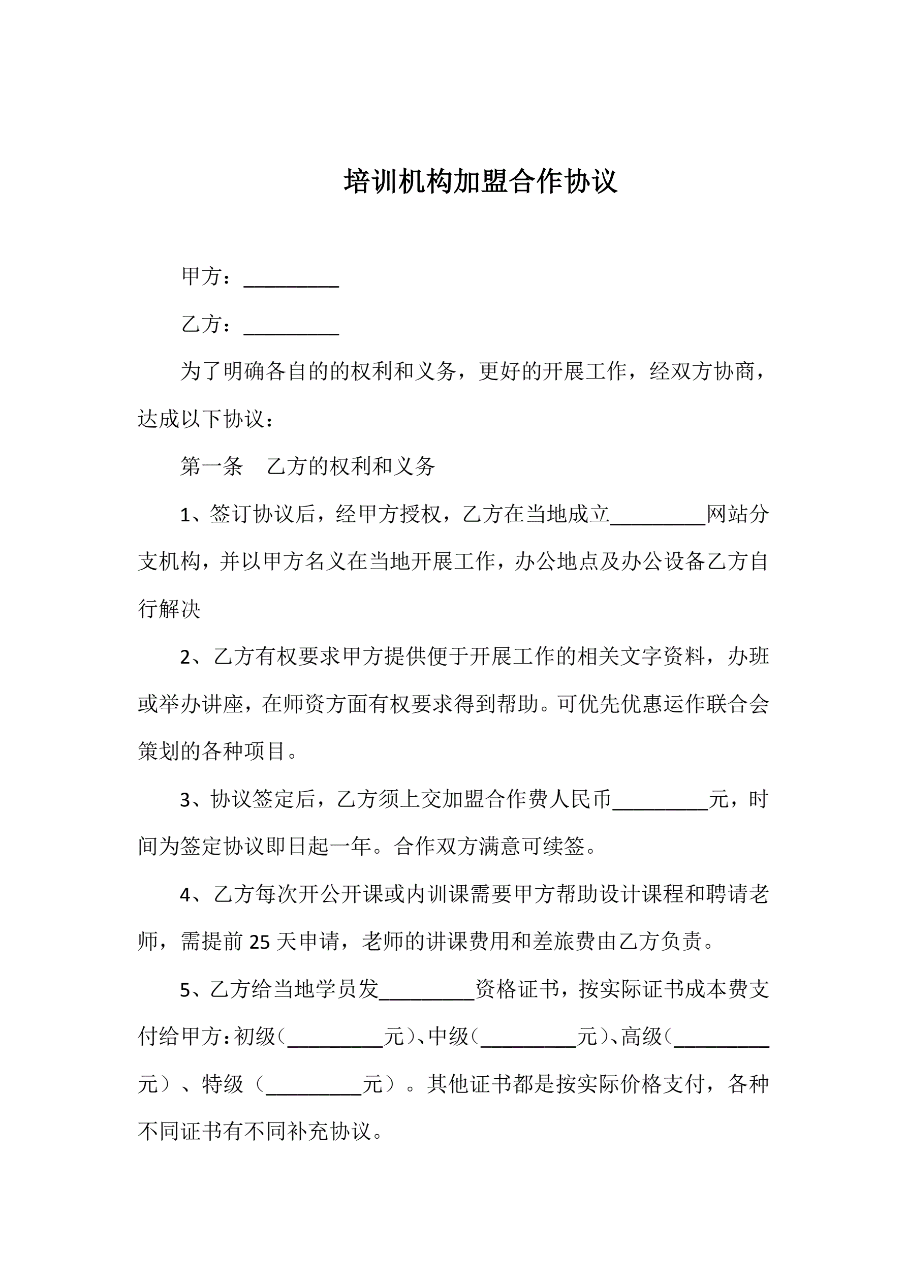 合同名称:培训机构加盟合作协议