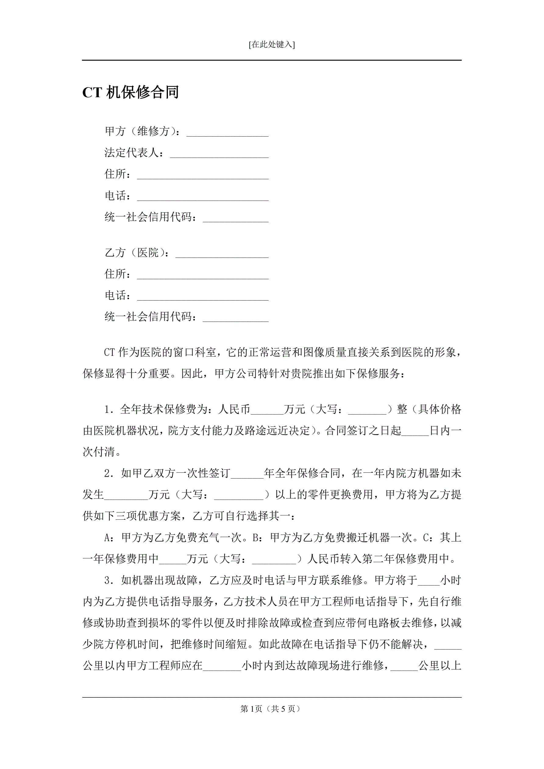 合同名称:CT机保修合同