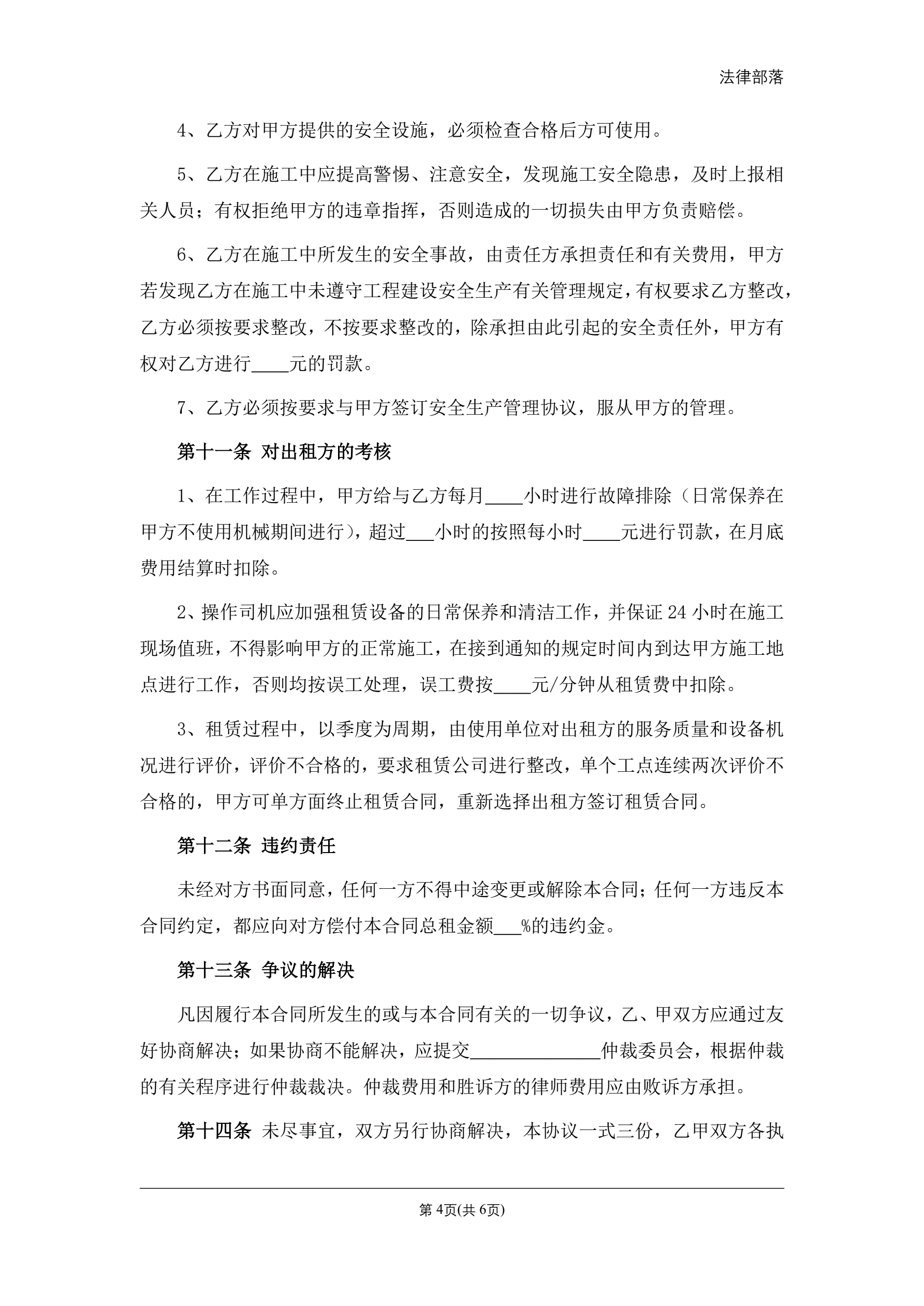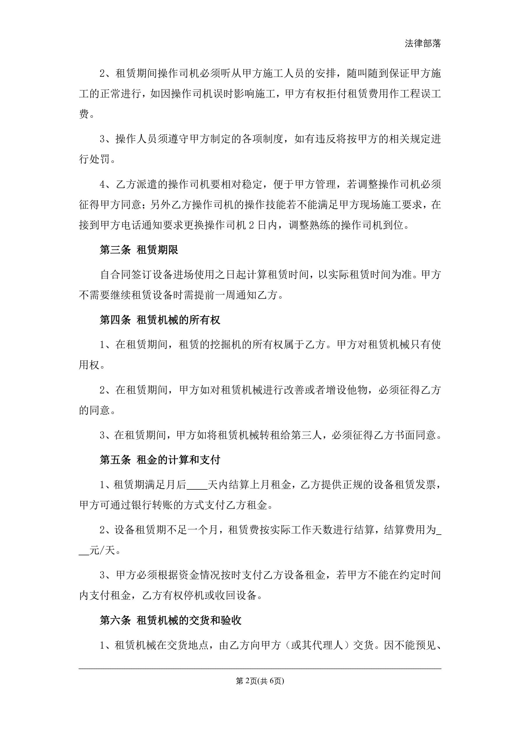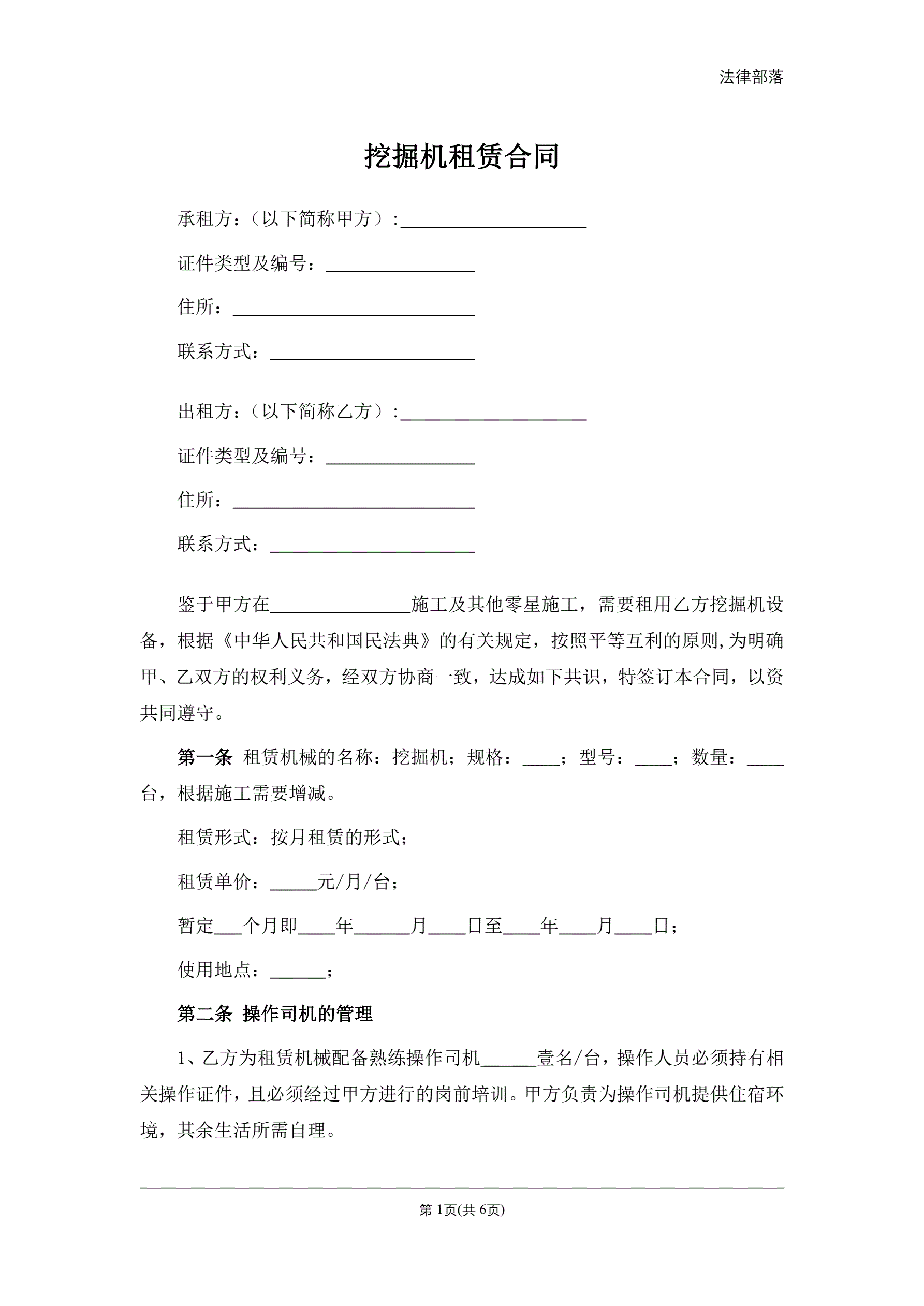 挖掘机租赁合同