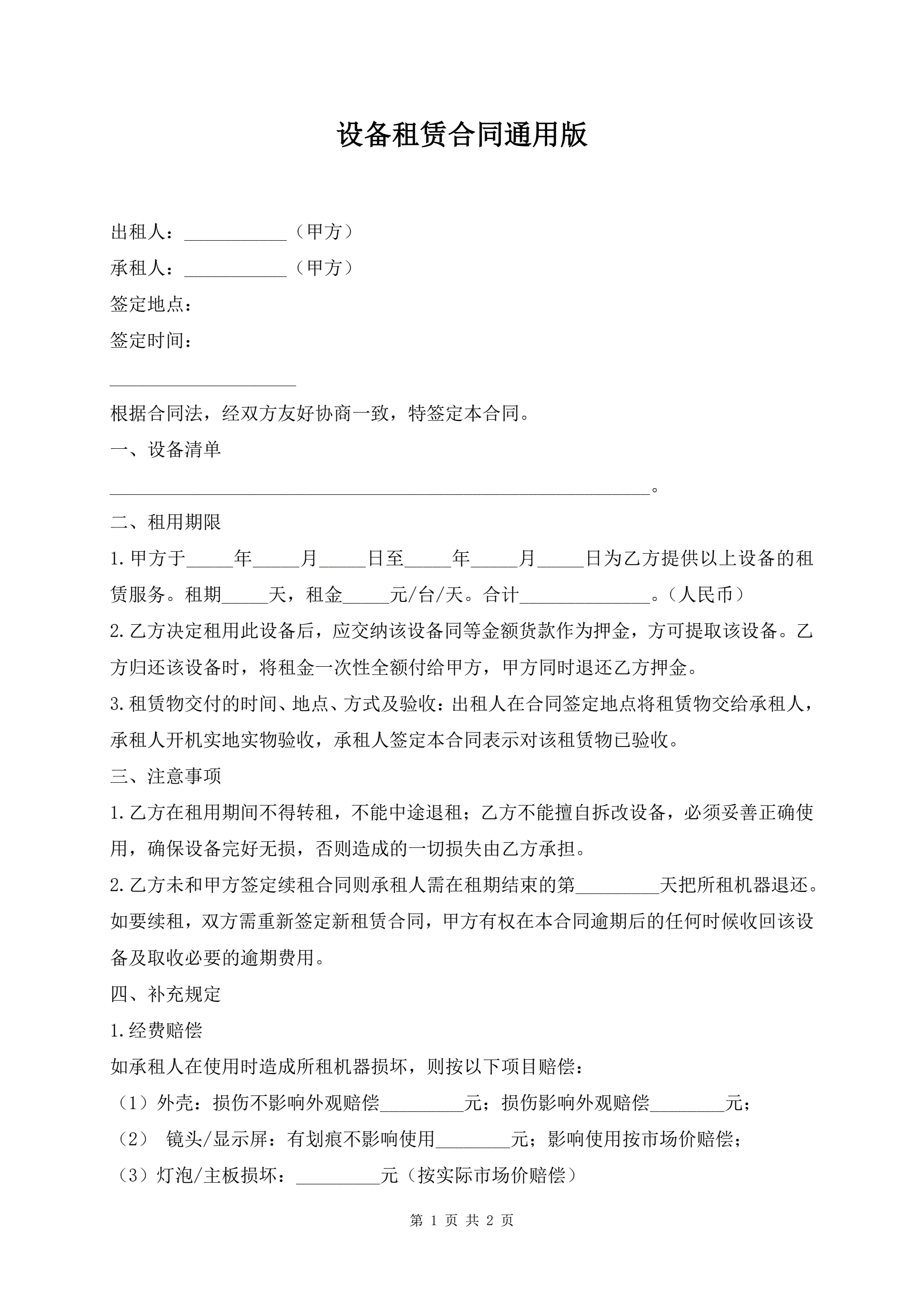 设备租赁合同通用版