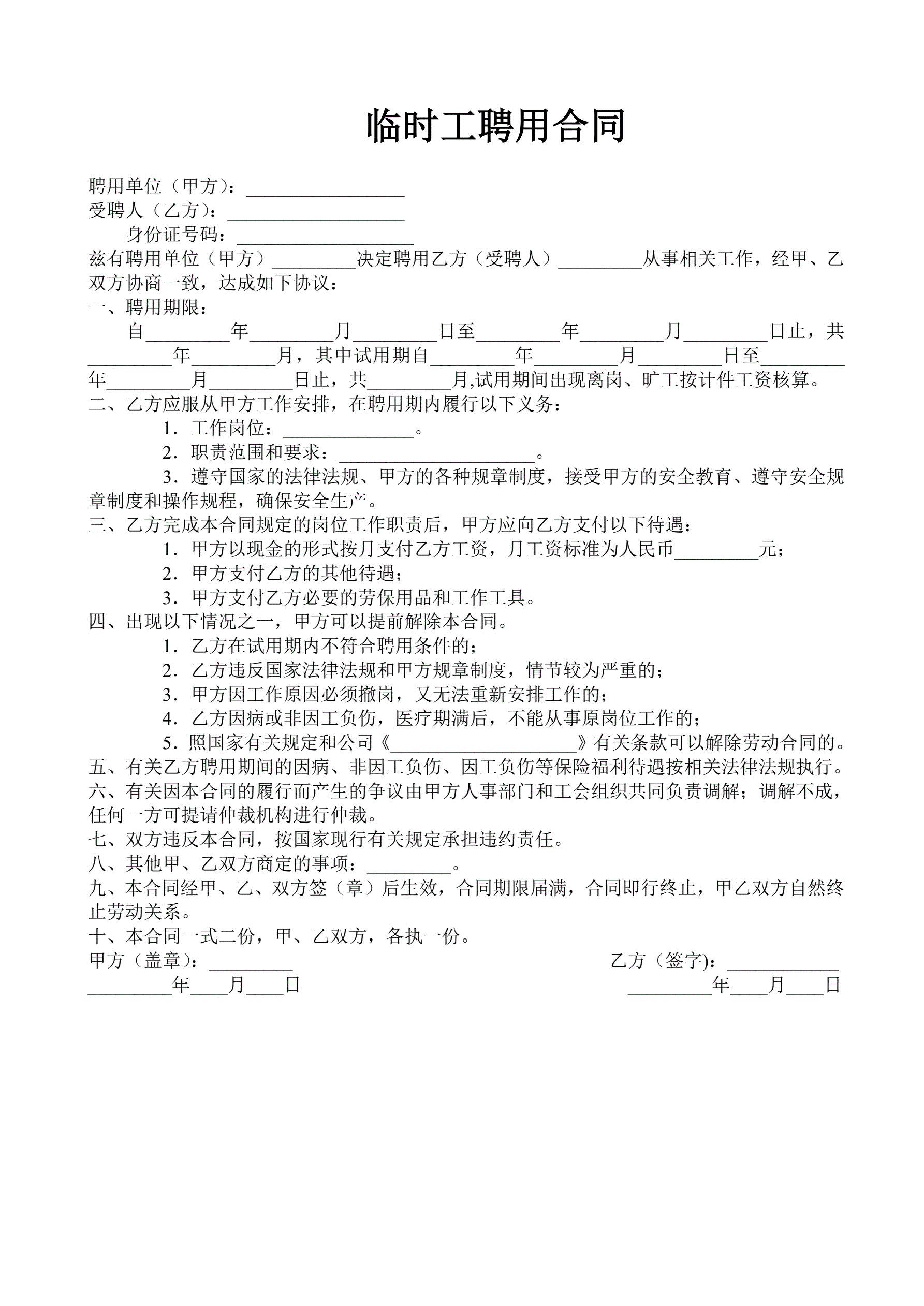 临时工聘用合同