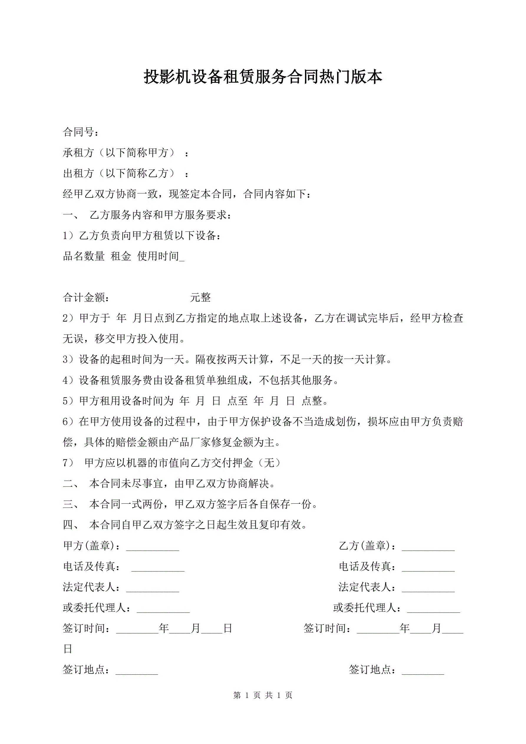 >投影机设备租赁服务合同热门版本