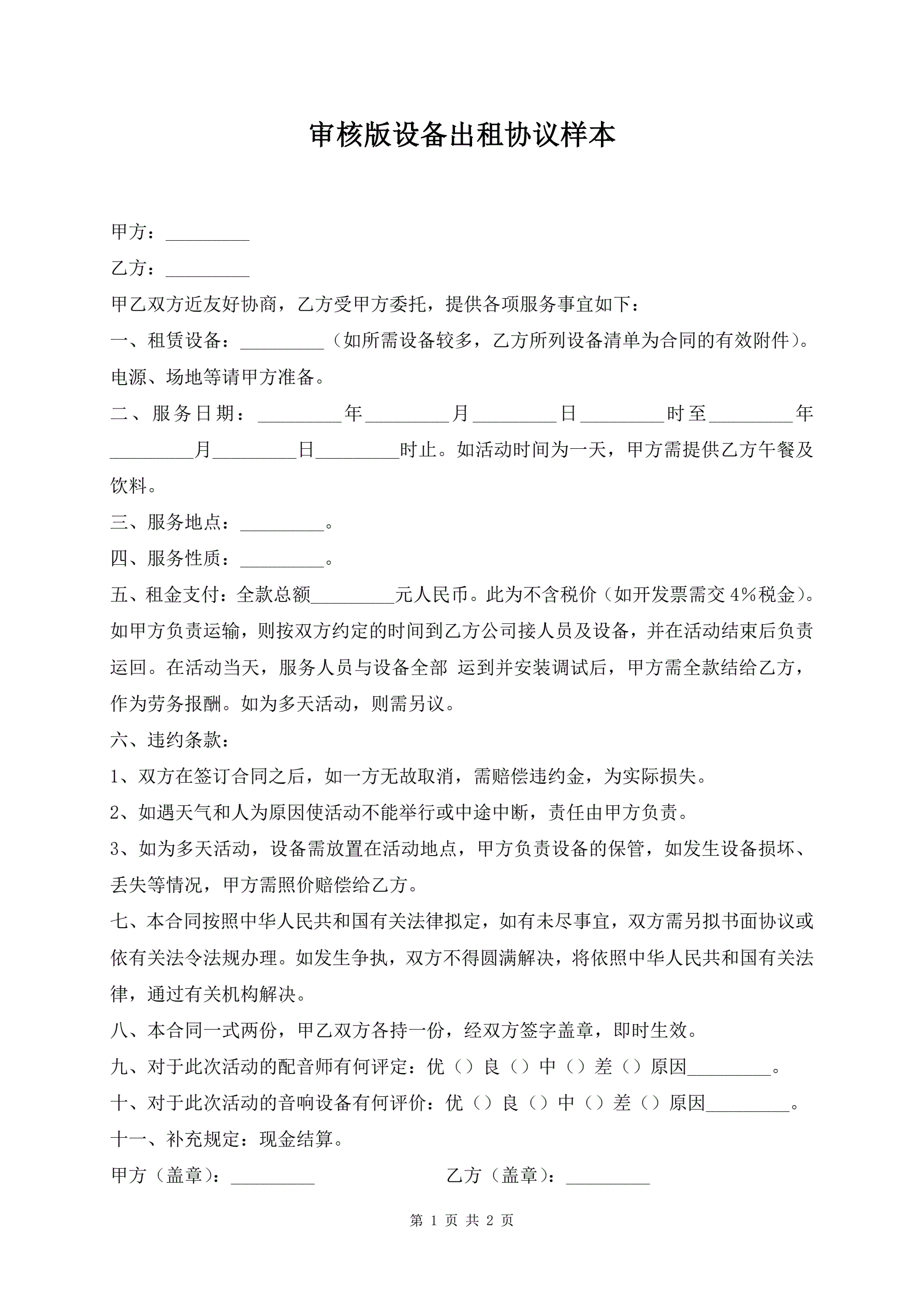 审核版设备出租协议样本
