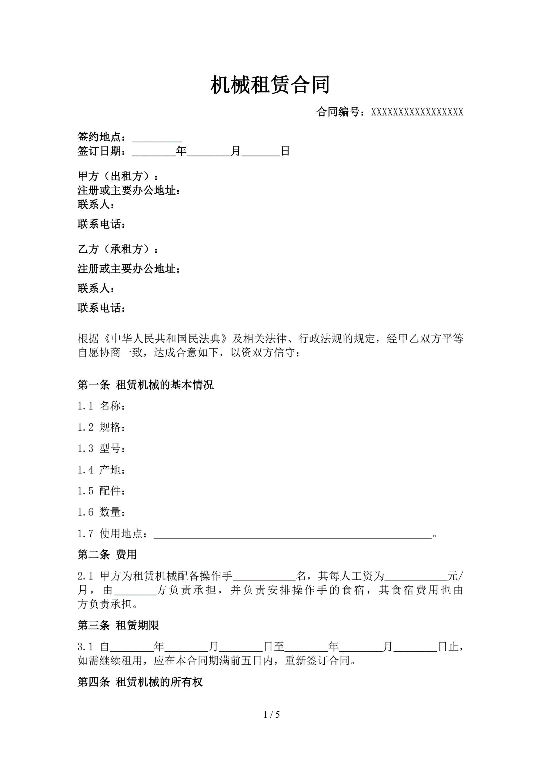 合同名称:机械租赁合同