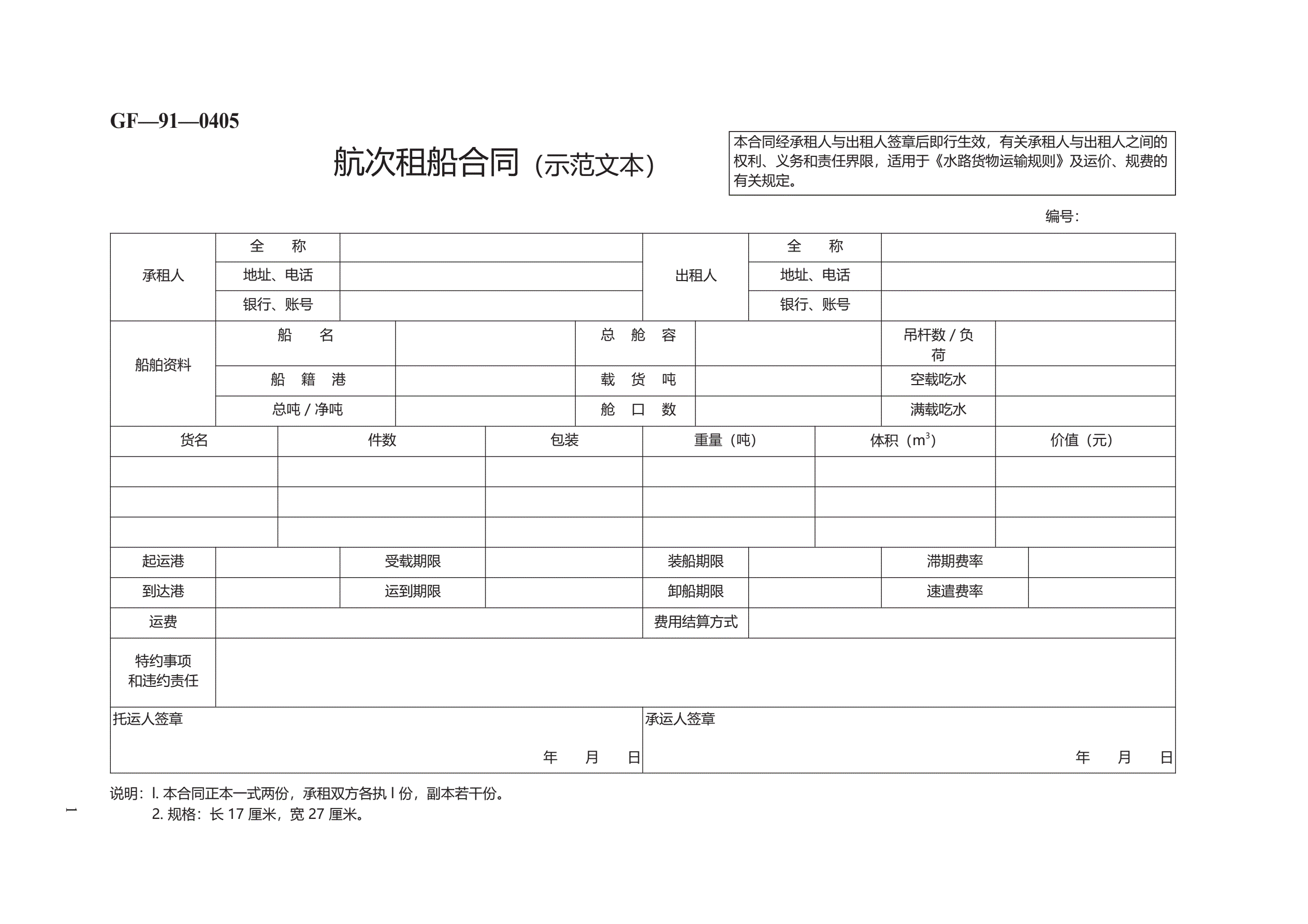 航次租船合同(示范文本) GF—91—0405