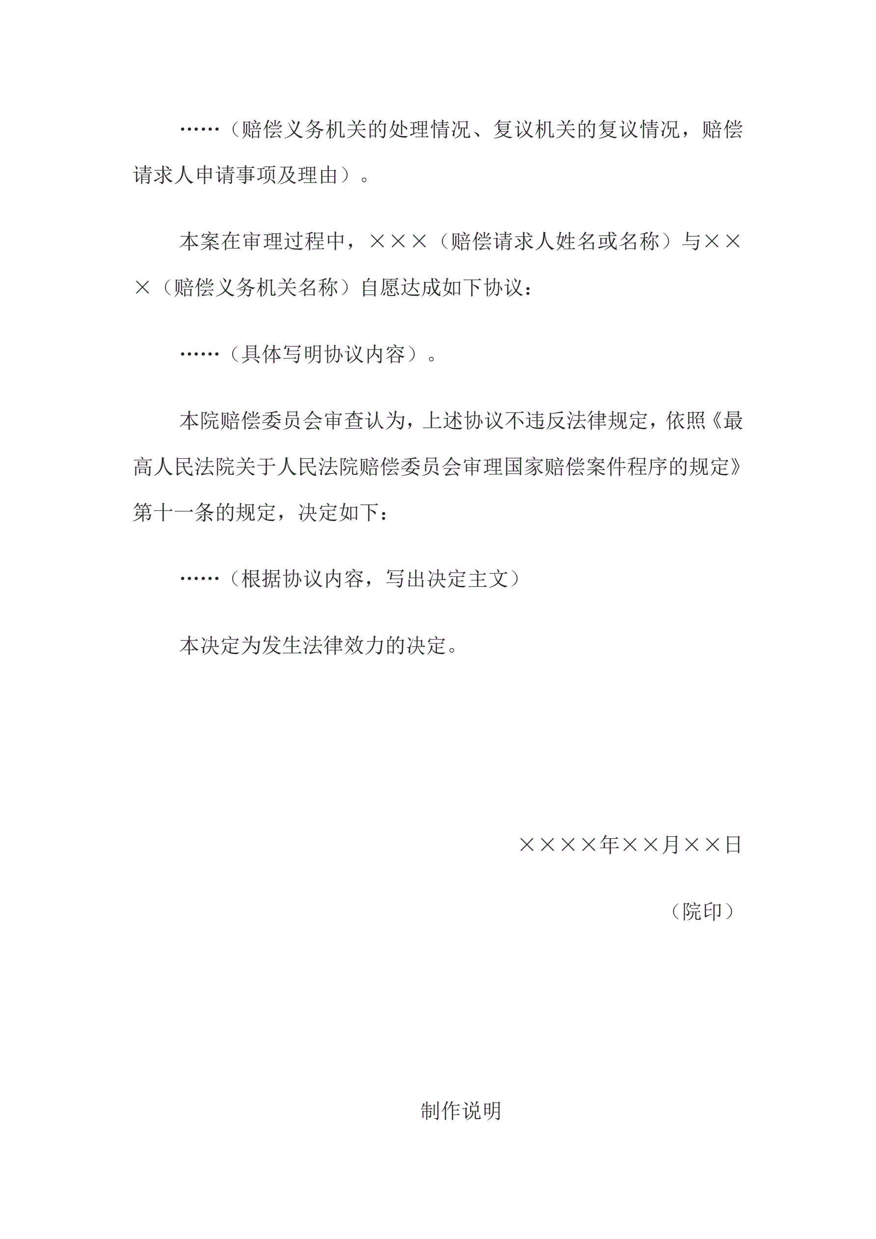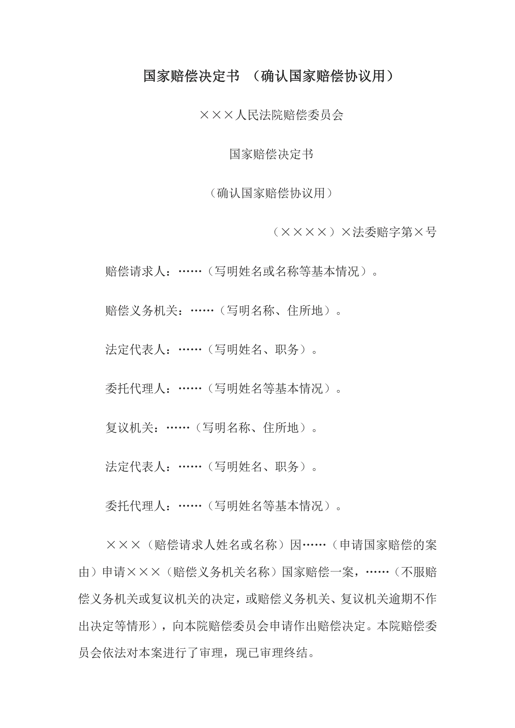 国家赔偿决定书(确认国家赔偿协议用)