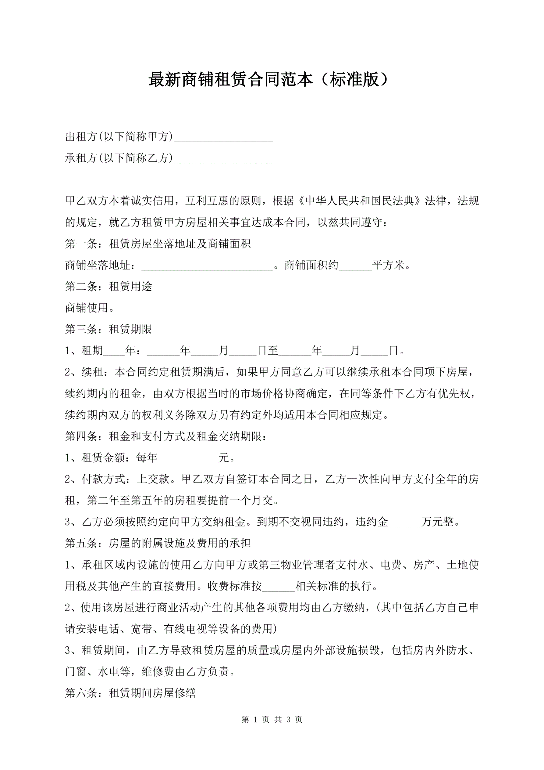 最新商铺租赁合同范本(标准版)