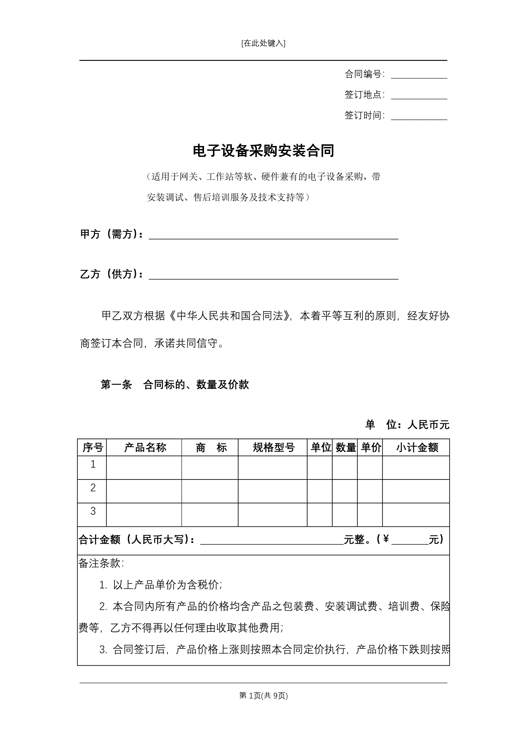 电子设备采购安装合同
