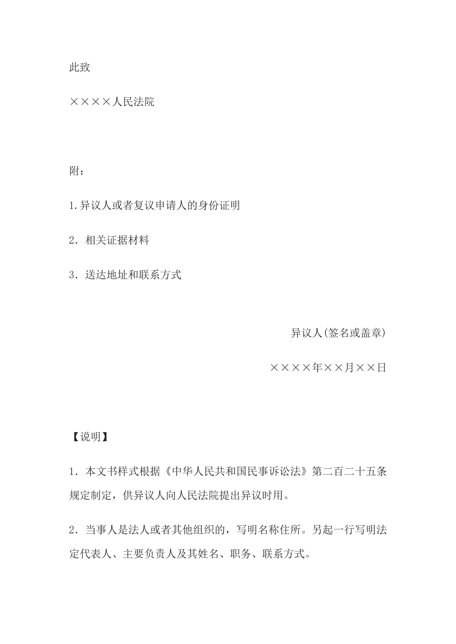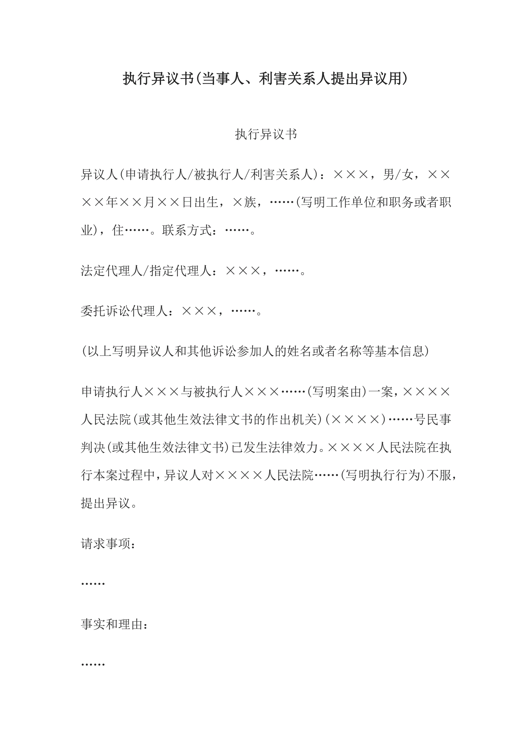 >执行异议书(当事人、利害关系人提出异议用)