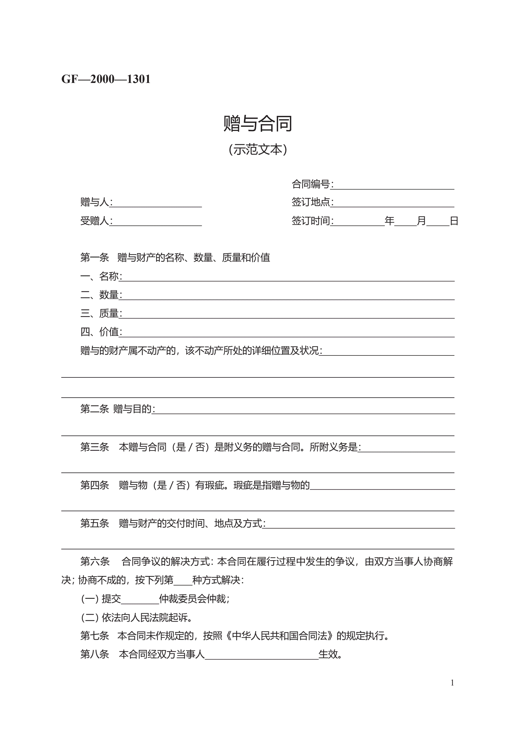>赠与合同 GF—2000—1301