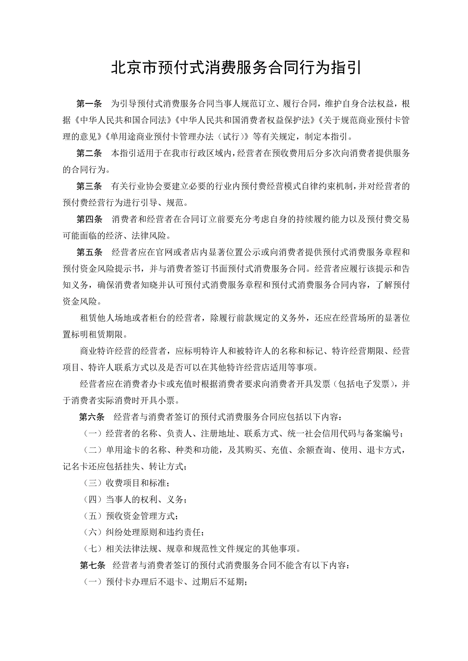 >北京市预付式消费服务合同行为指引(2020)
