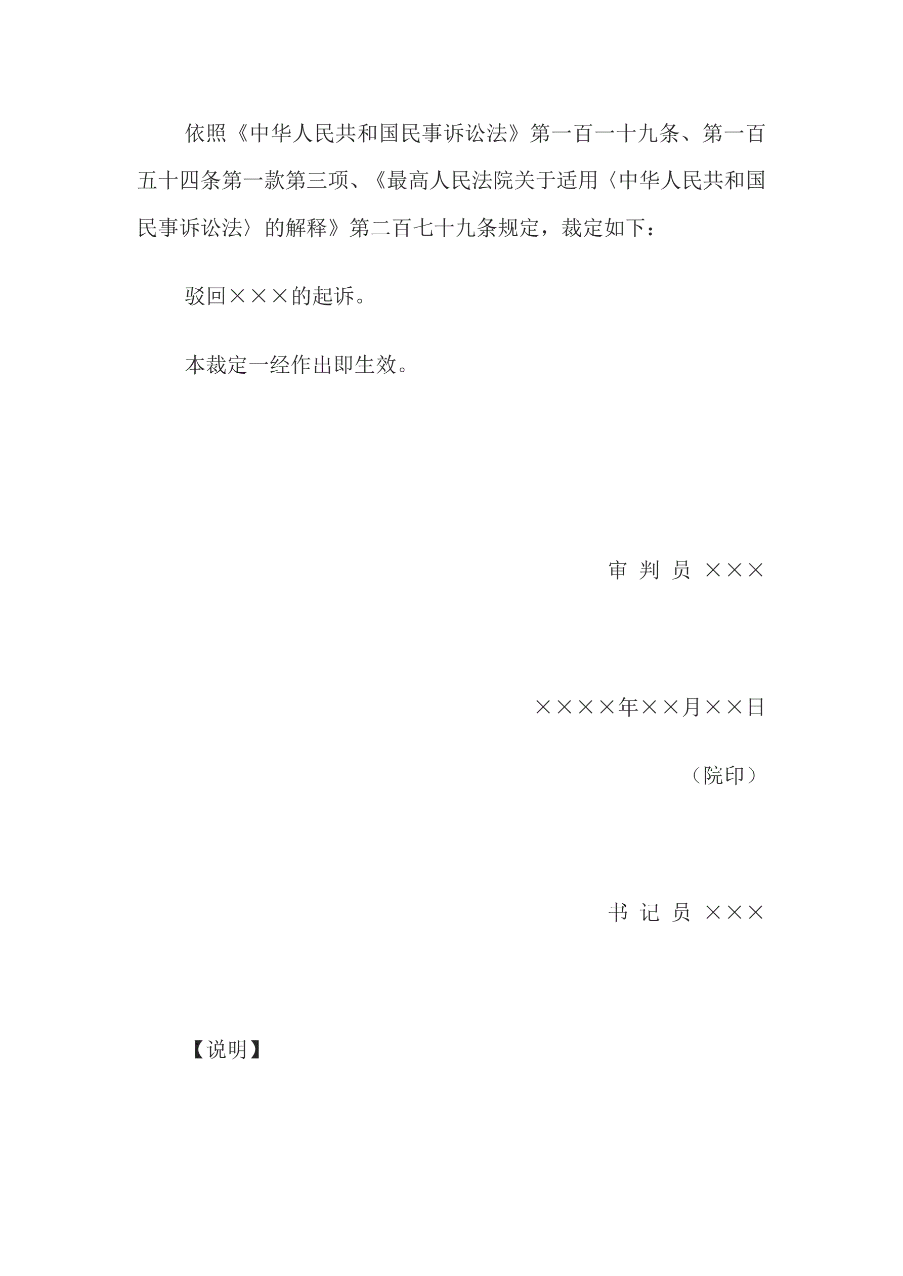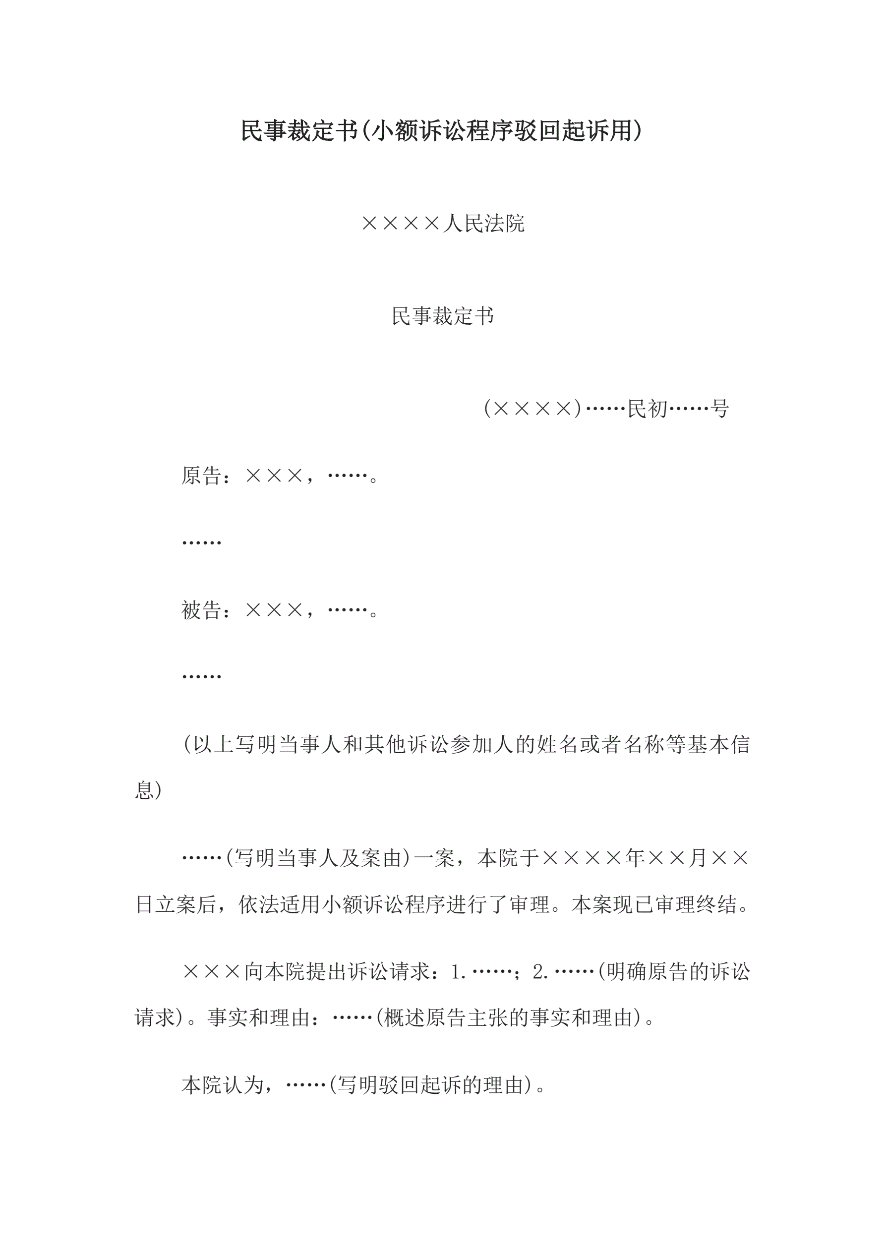 >民事裁定书(小额诉讼程序驳回起诉用)