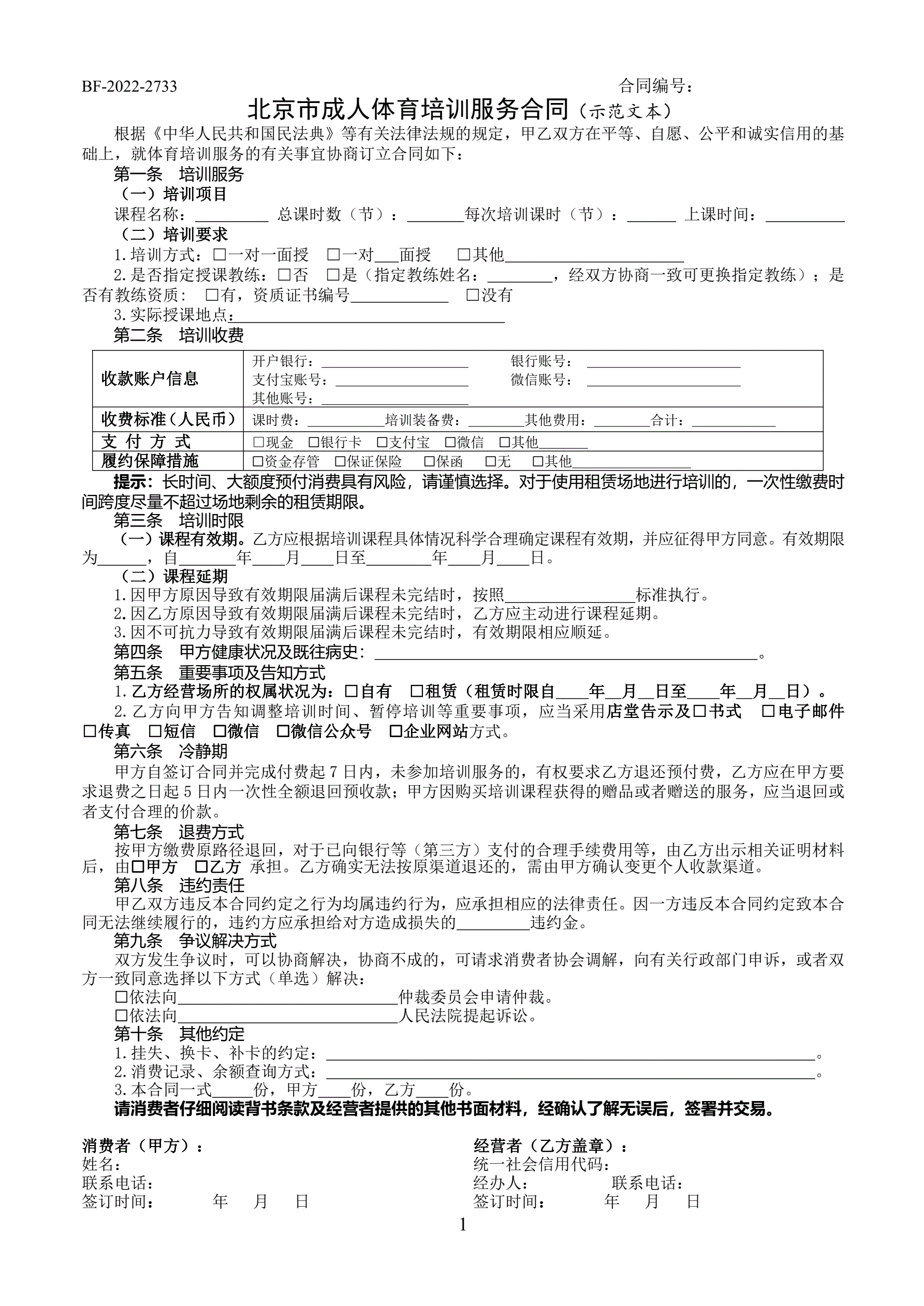 北京市成人体育培训服务合同(2022)